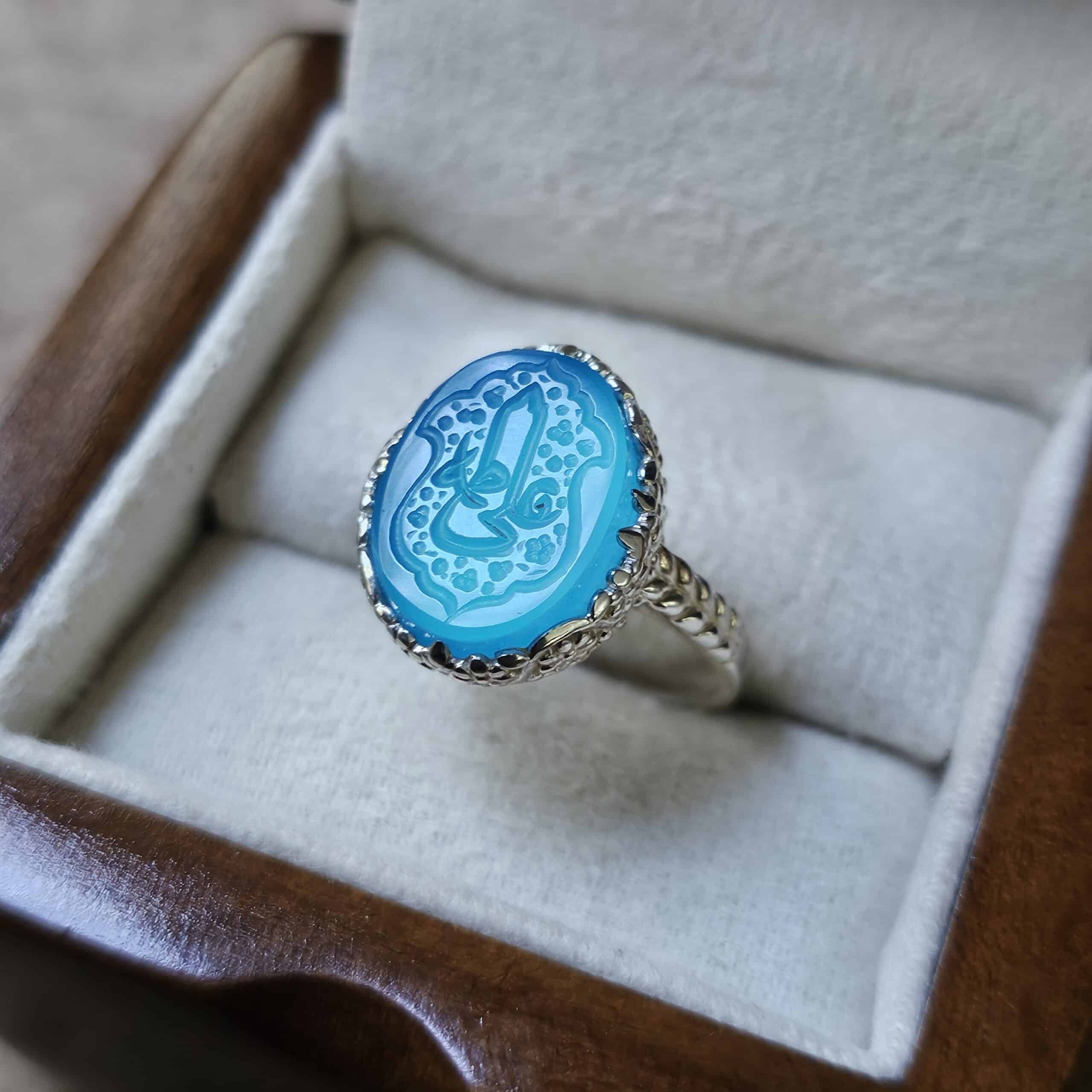 انگشتر عقیق اصل زنانه با طراحی زیبا و حکاکی نامهای مبارک علی (ع) و فاطمه (س)، انتخابی ارزشمند برای علاقهمندان به زیورآلات مذهبی و معنوی.
