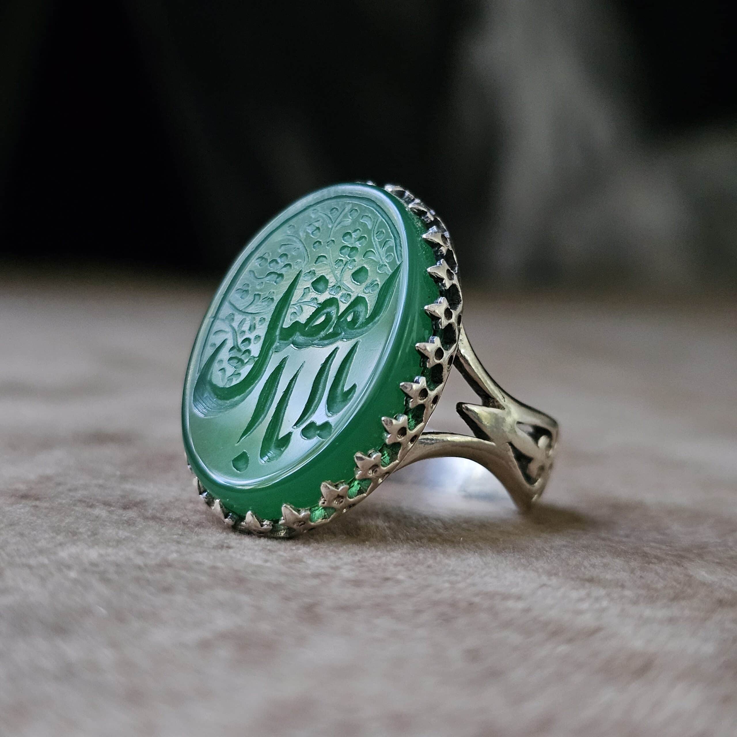 انگشتر عقیق سبز اصل مردانه با حکاکی نام مبارک یا اباالفضل (ع)، زیوری معنوی و ارزشمند برای عاشقان اهل بیت (ع).