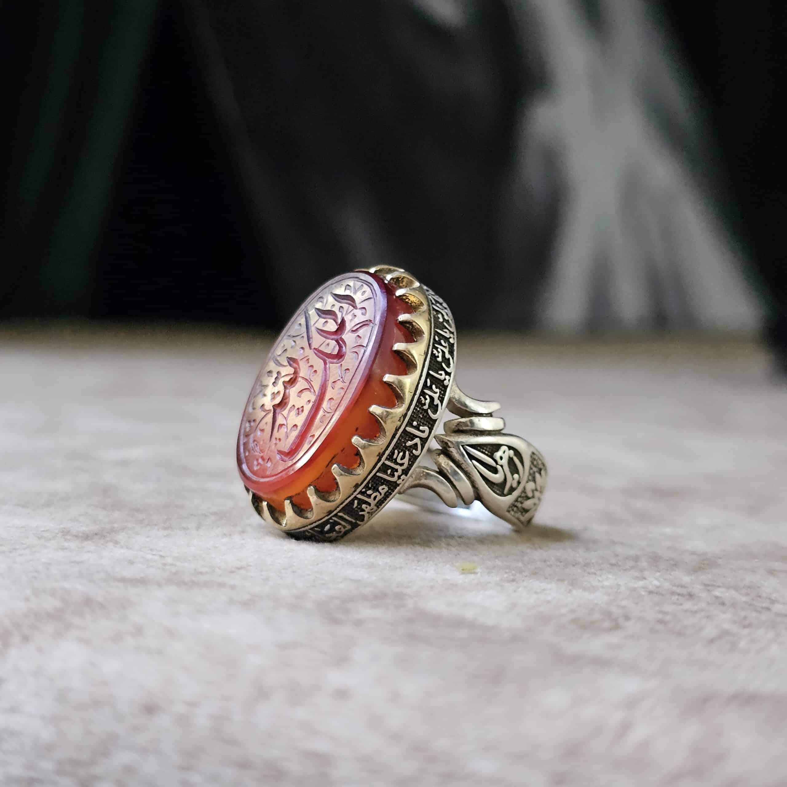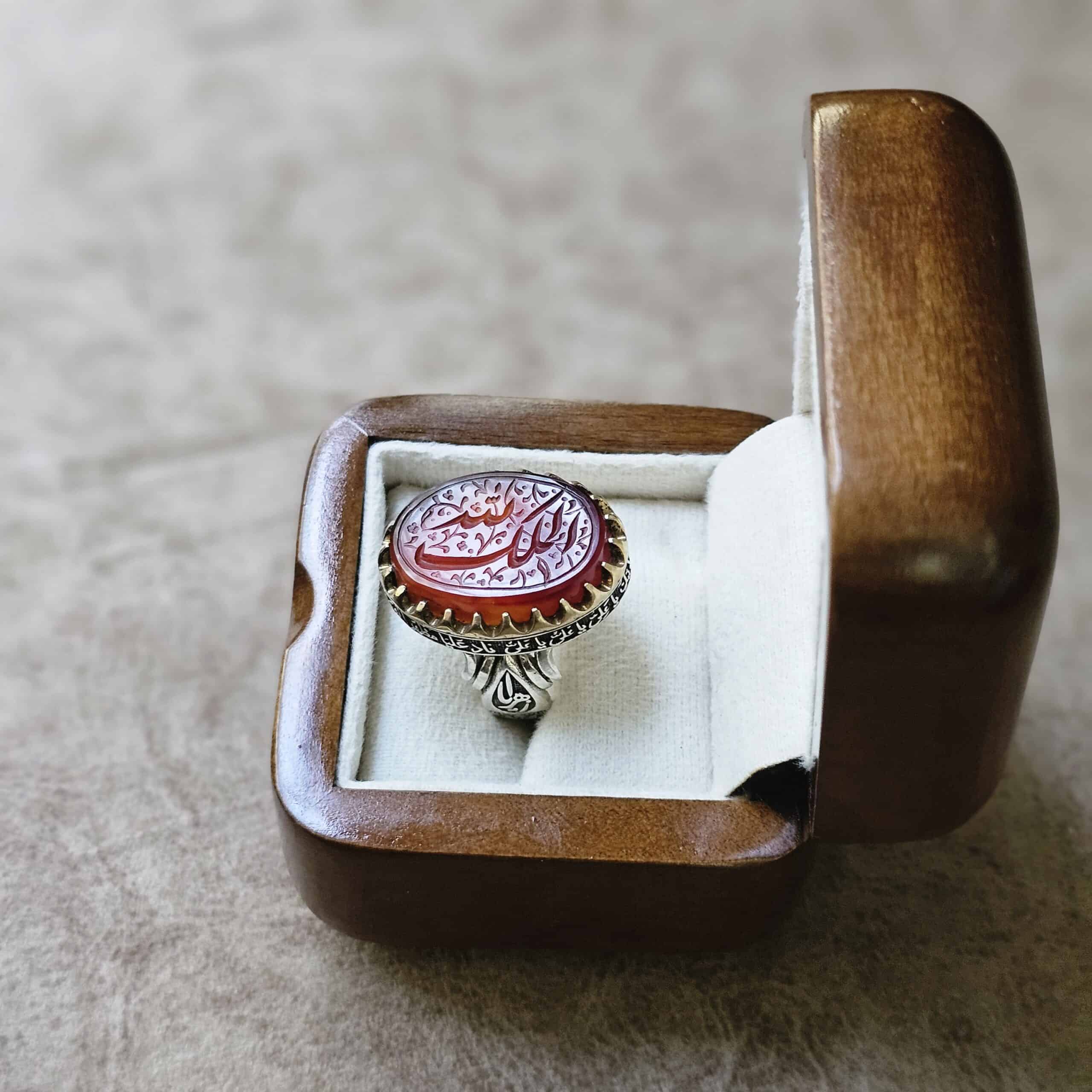 انگشتر عقیق مردانه همواره جایگاه ویژهای در میان زیورآلات مذهبی و سنتی داشته است. این انگشتر با سنگ عقیق اصل طراحی شده و بر روی آن عبارت روحانی الملک لله با ظرافت حکاکی شده است.