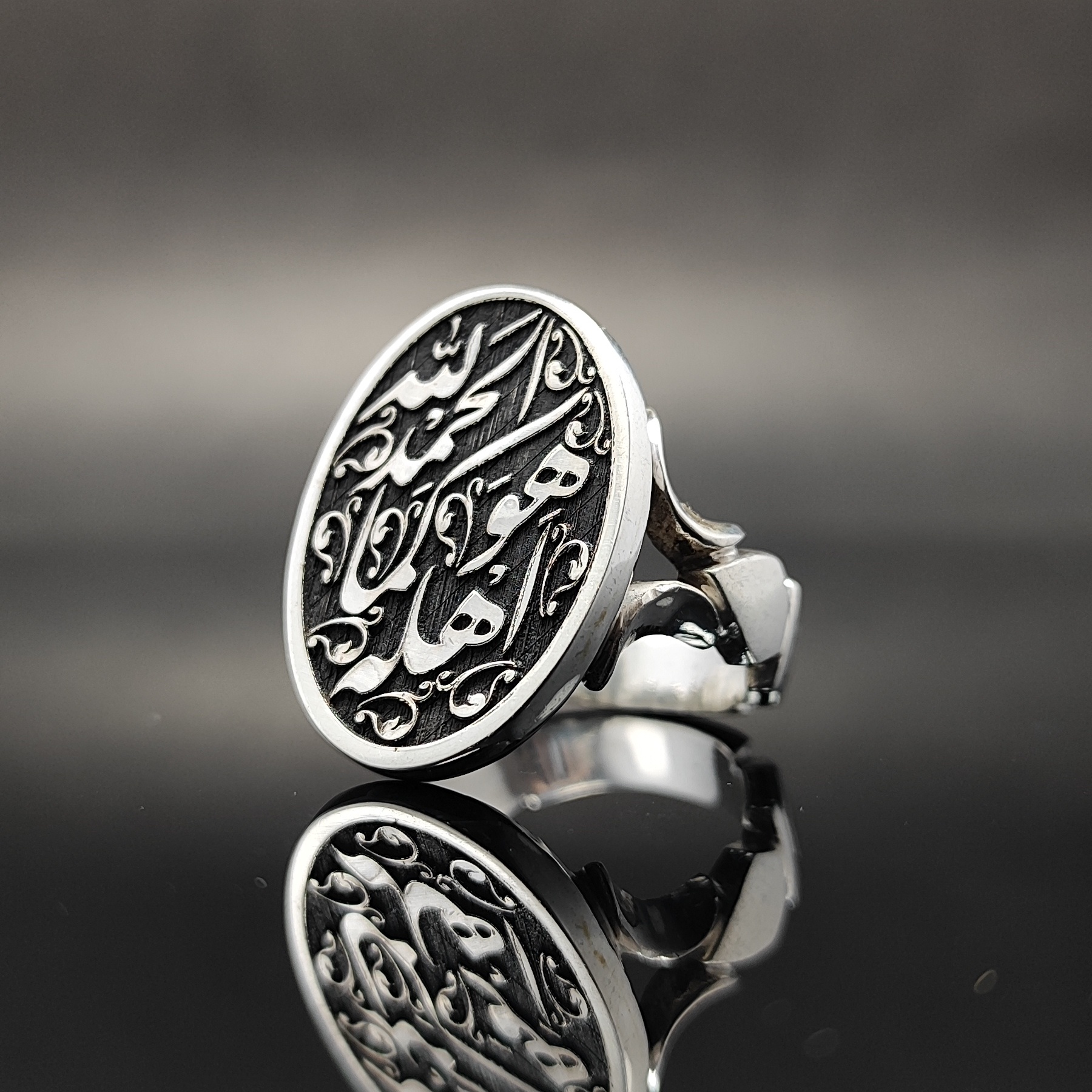 انگشتر نقره تمامدست با ذکر معنوی «الحمدالله کما هو اهله»، ساختهشده از نقره اصل ۹۲۵ با طراحی خاص و فاخر.