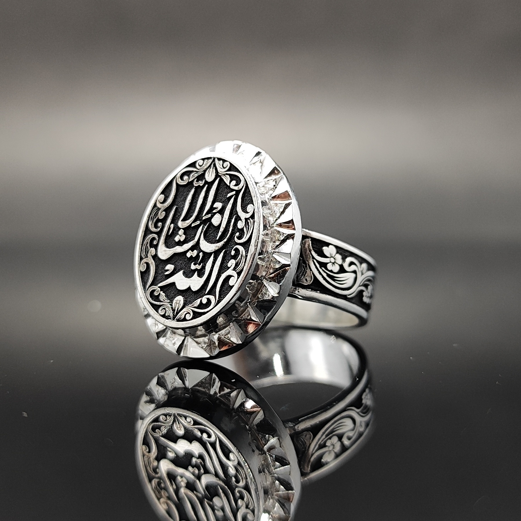 انگشتر نقره تمامدست با ذکر معنوی «الا ان یشاء الله مدل 5»، ساختهشده از نقره اصل ۹۲۵ با طراحی خاص و فاخر.