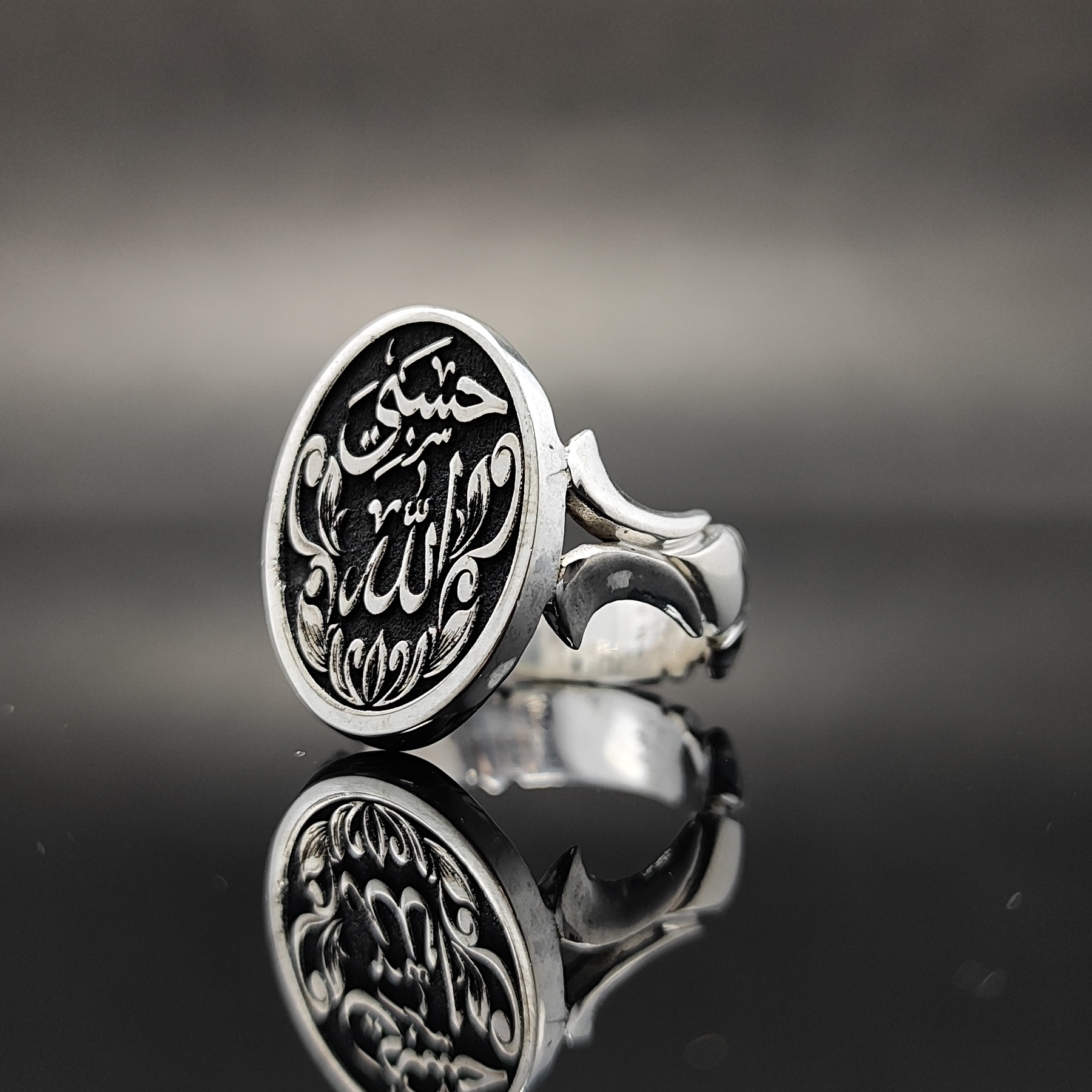 انگشتر نقره تمام‌دست با ذکر معنوی «حسبی الله»، ساخته‌شده از نقره اصل ۹۲۵ با طراحی خاص و فاخر.