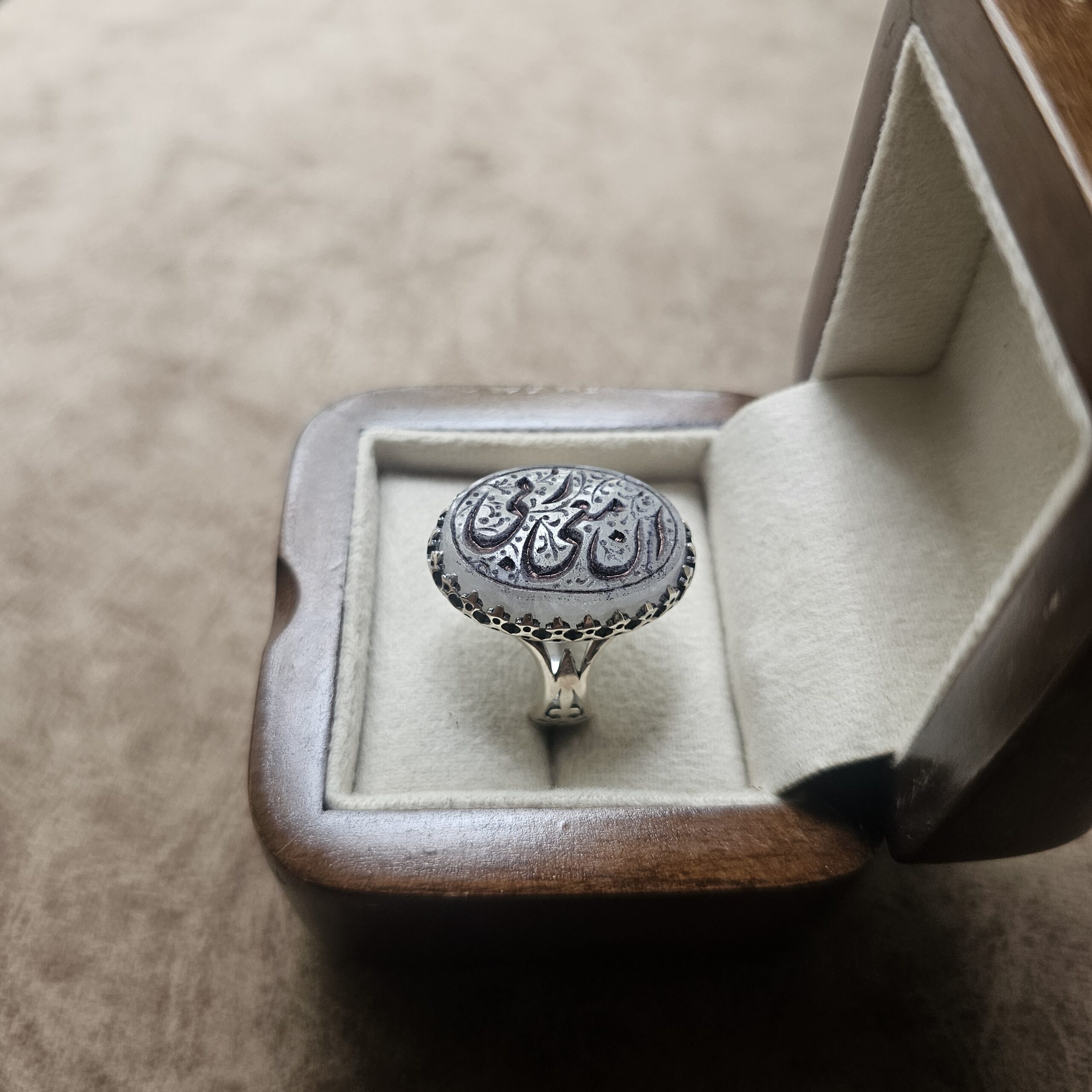 انگشتر نقره عیار ۹۲۵ با سنگ متبرک حرم امام حسین (ع) و حکاکی عبارت نورانی “اِنَّ مَعِیَ رَبّی”؛ نمادی از ایمان، توکل و آرامش درونی.