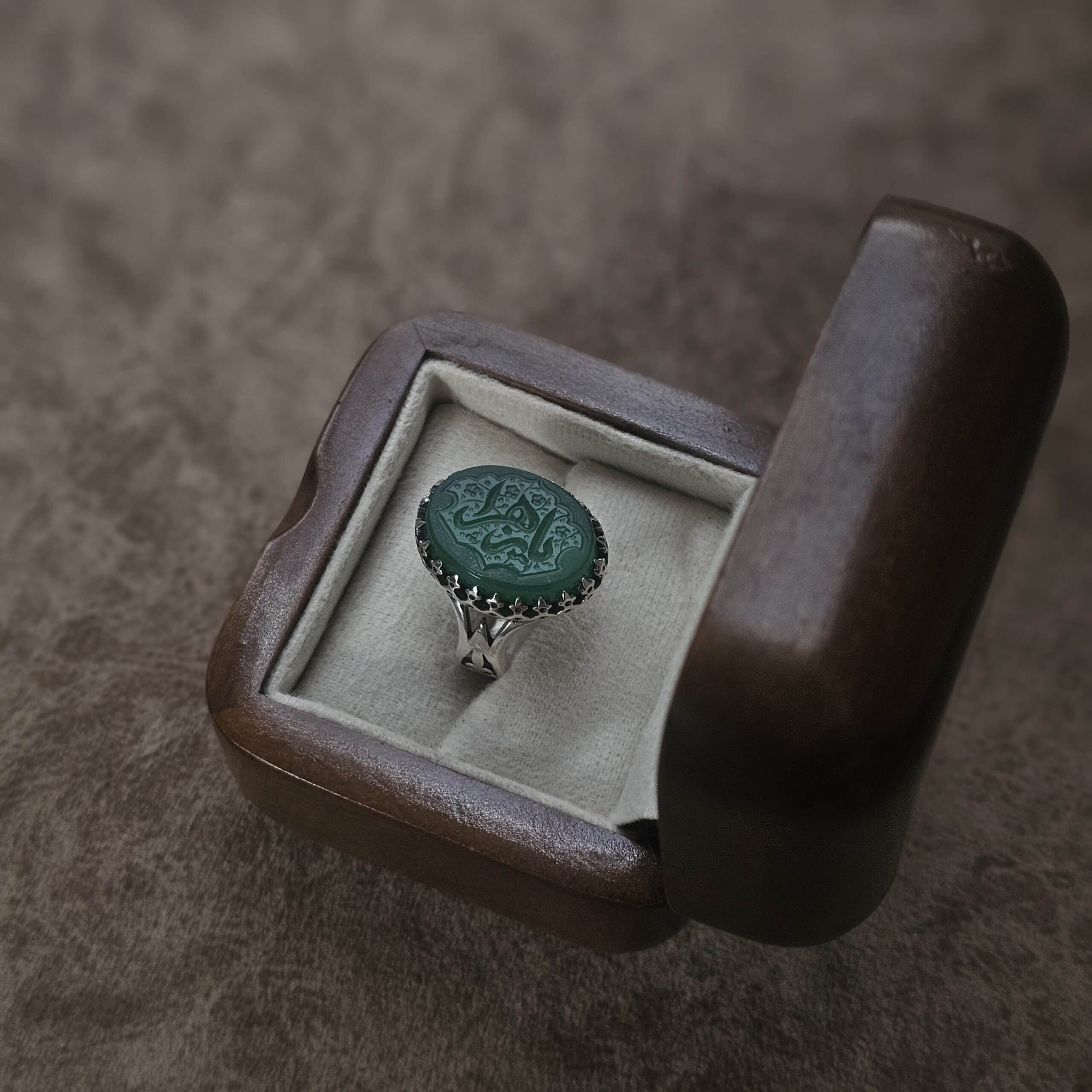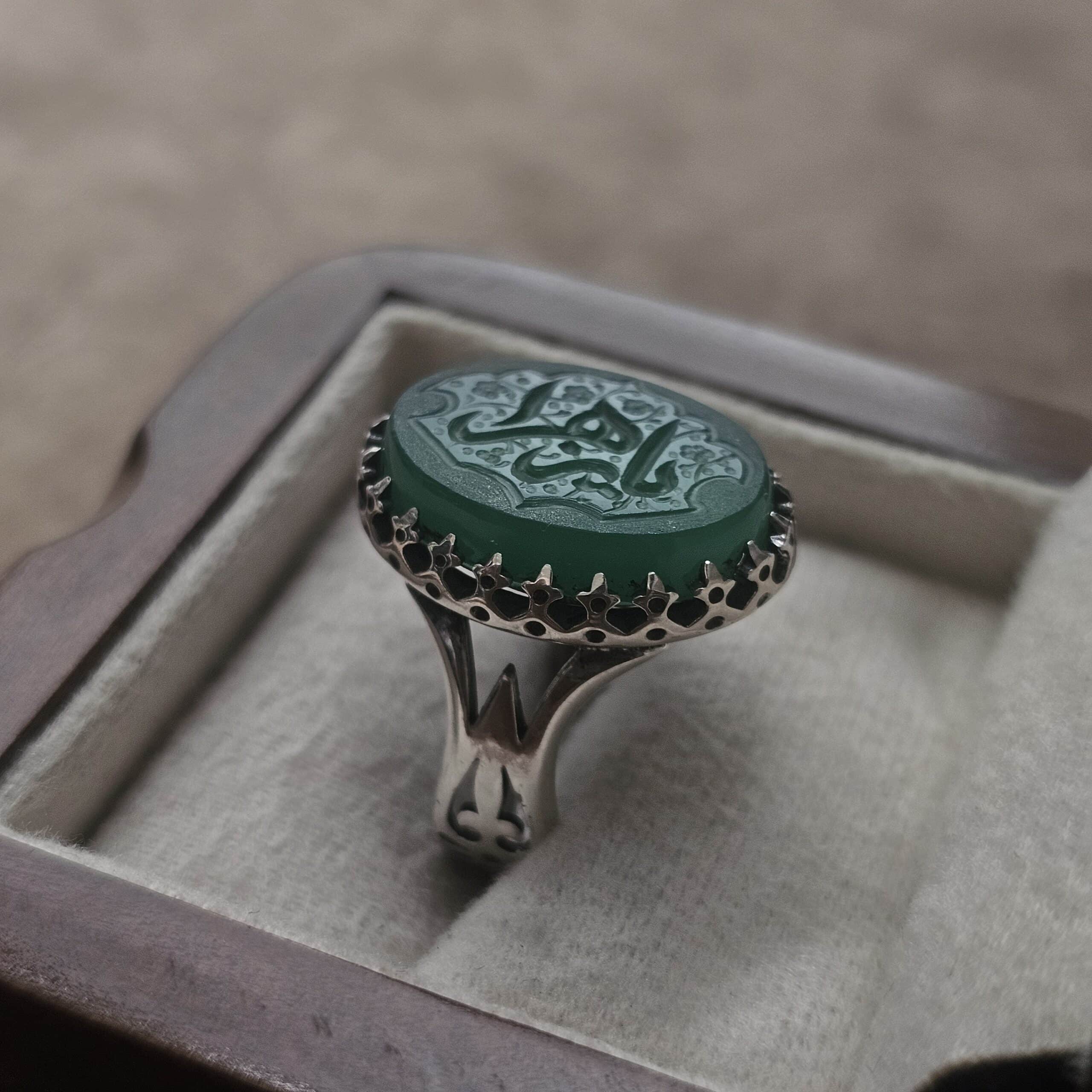این انگشتر نقره عقیق سبز طرح یا زهرا (س) جلوهای از آرامش، اصالت و معنویت را در کنار خود دارد.