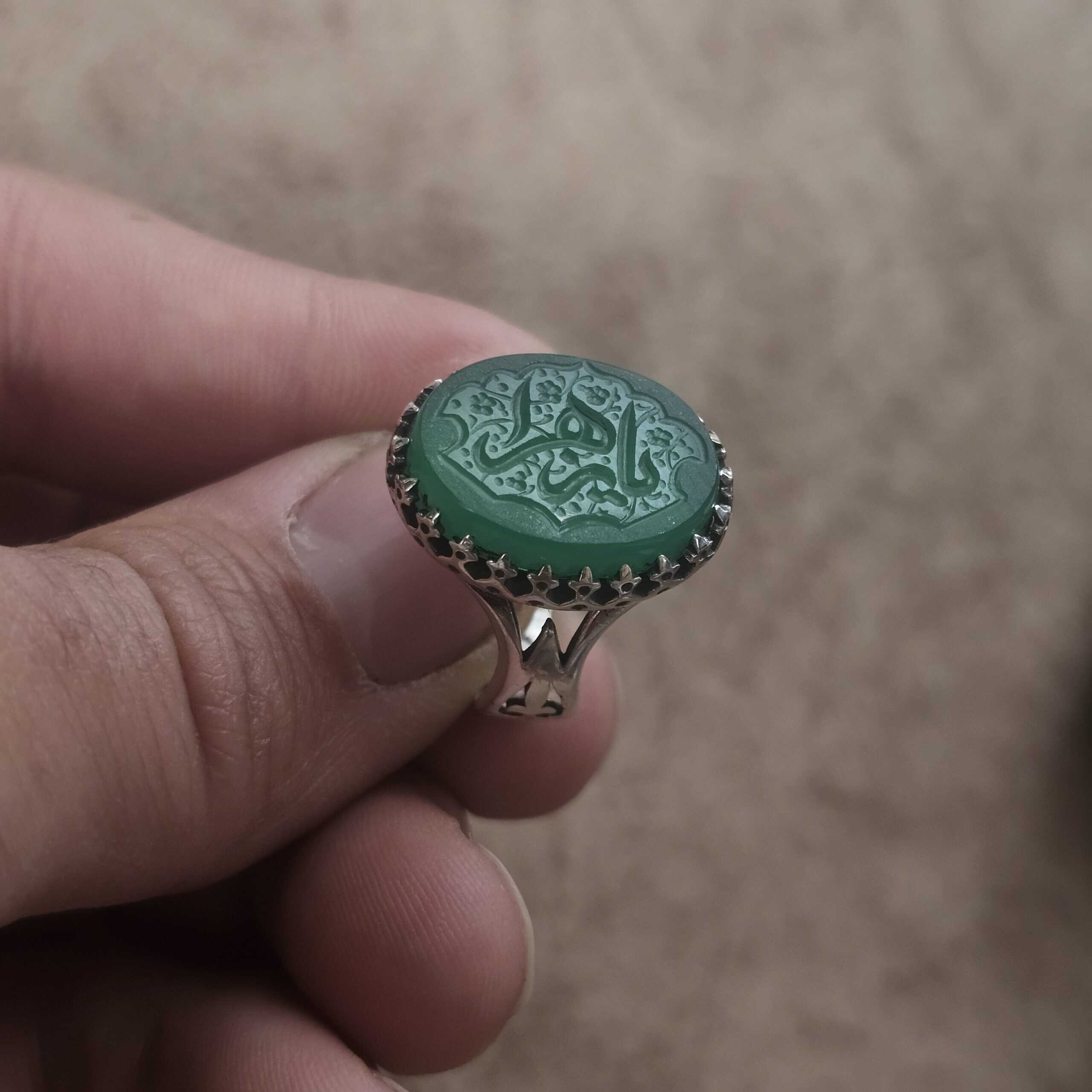 انگشتر نقره زیبا با نگین عقیق سبز طبیعی و حکاکی معنوی یا زهرا (س)؛ ساختهشده از نقره اصل عیار ۹۲۵ با طراحی شیک و چشمگیر.