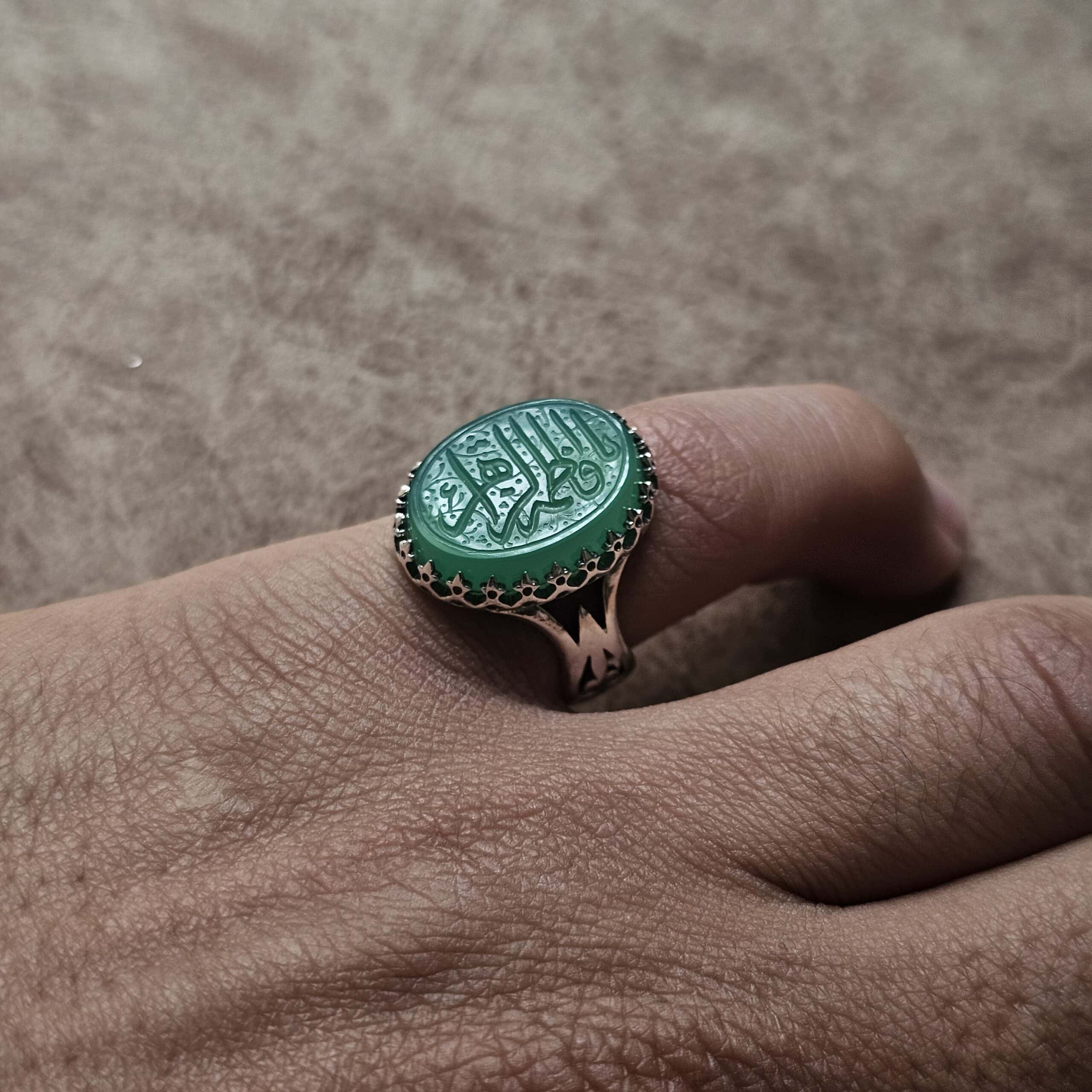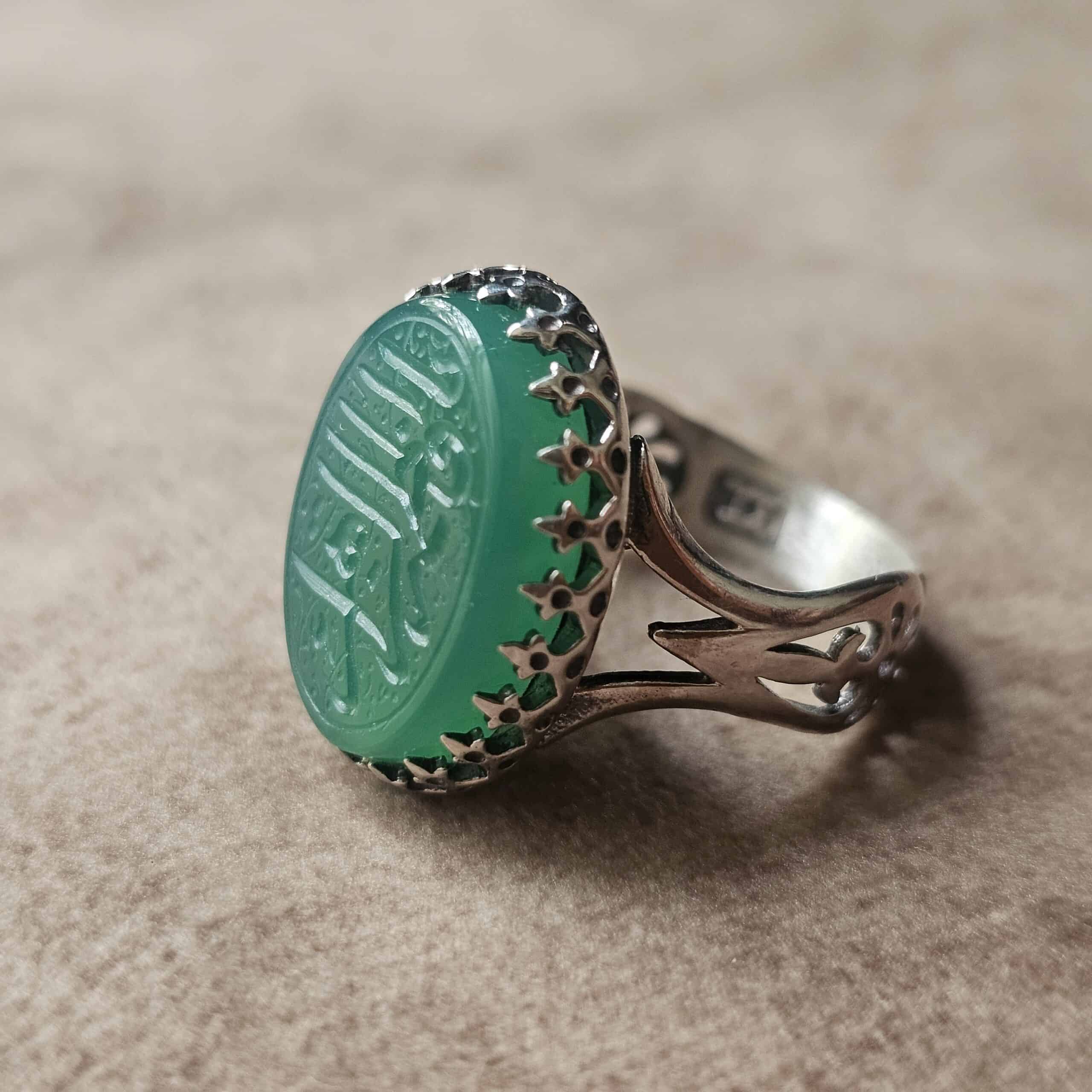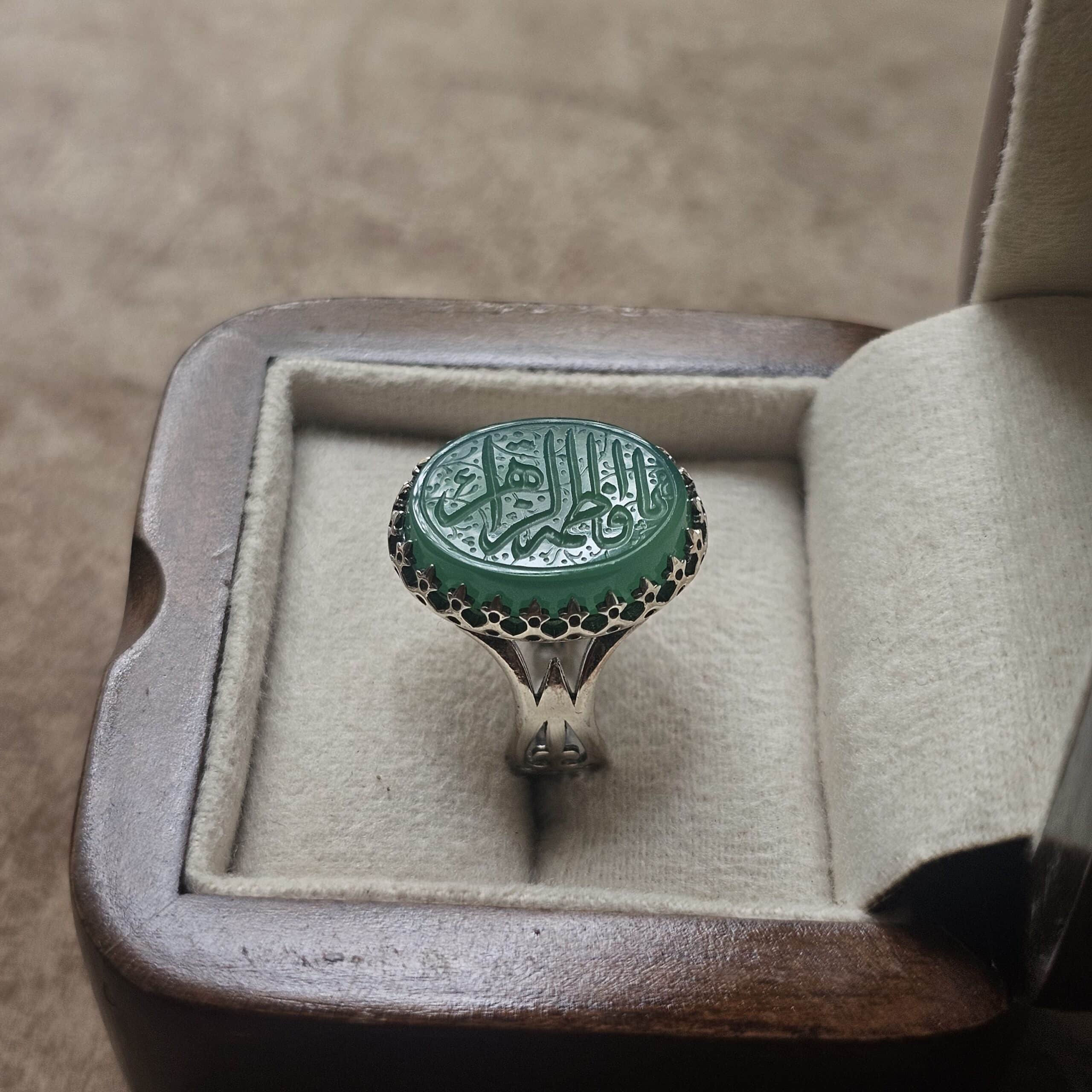 انگشتر نقره عیار ۹۲۵ با نگین عقیق سبز اصل و حکاکی نام مبارک حضرت فاطمه الزهرا (س)؛