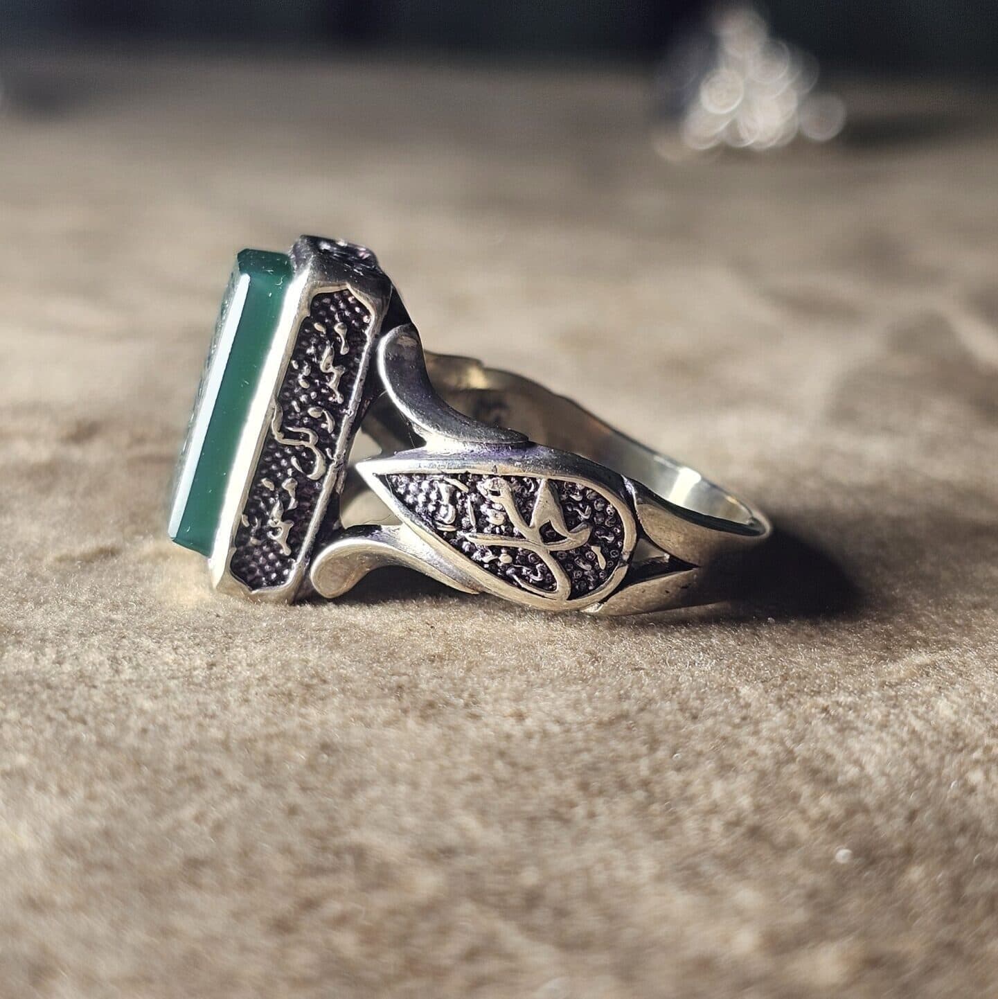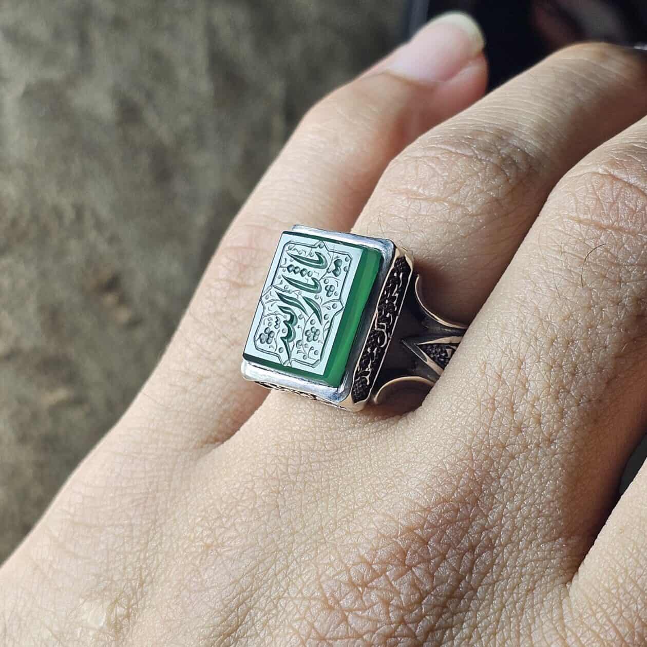 این انگشتر نقره مردانه طرح یا ثارالله با نگین عقیق سبز طبیعی، نمادی از وفاداری، شجاعت و ایمان است. واژهی «یا ثارالله» یادآور قیام عاشورا و خون پاک امام حسین (ع) است که برای احیای دین و حقیقت نثار شد.