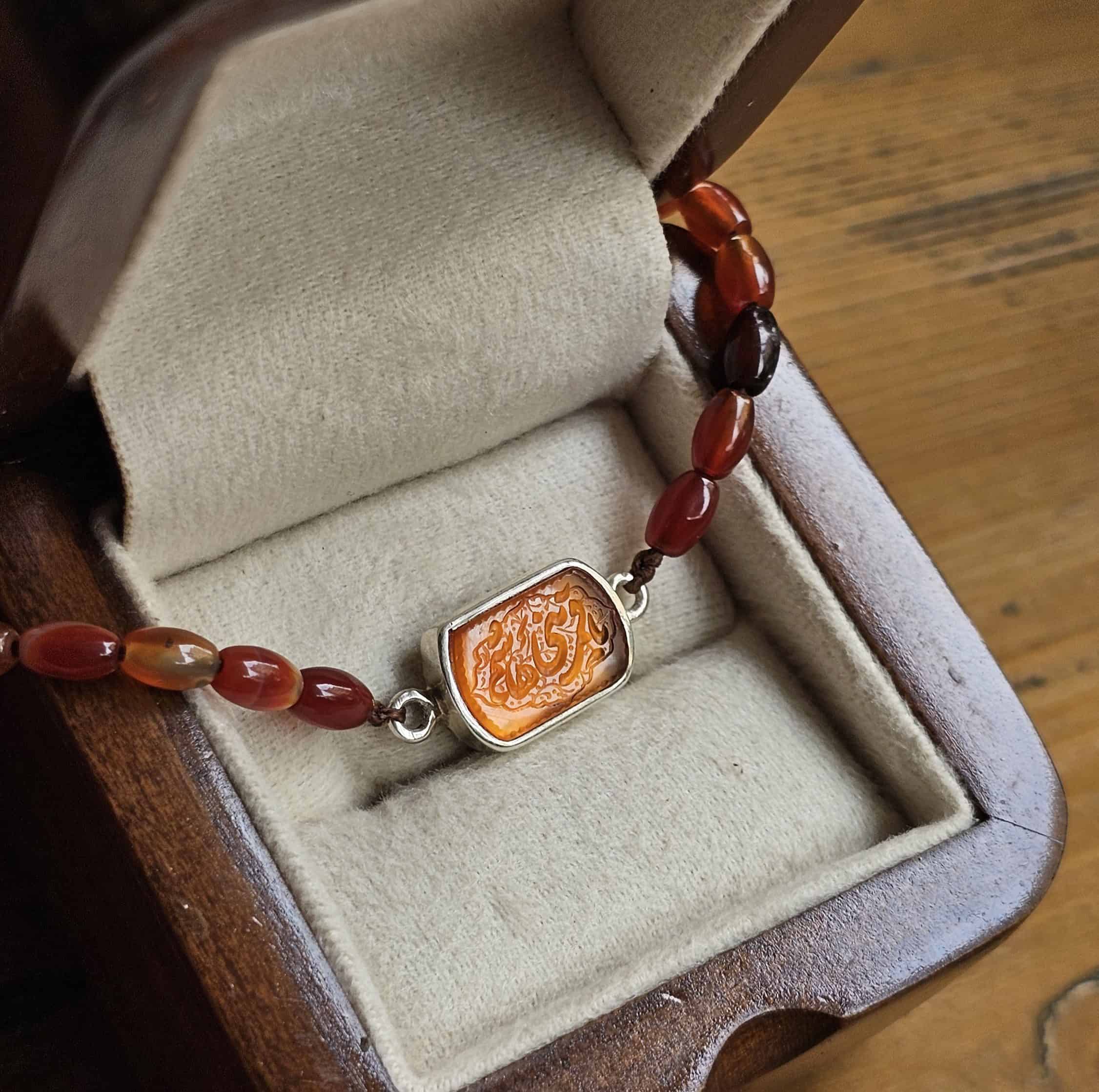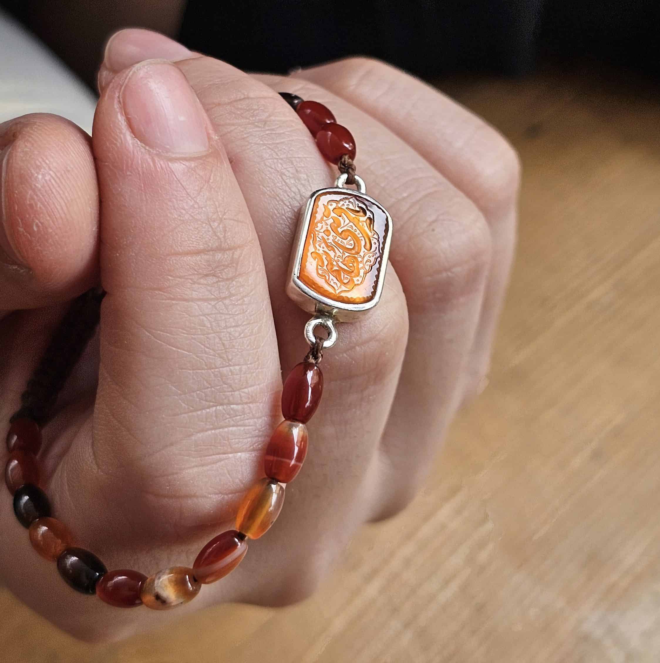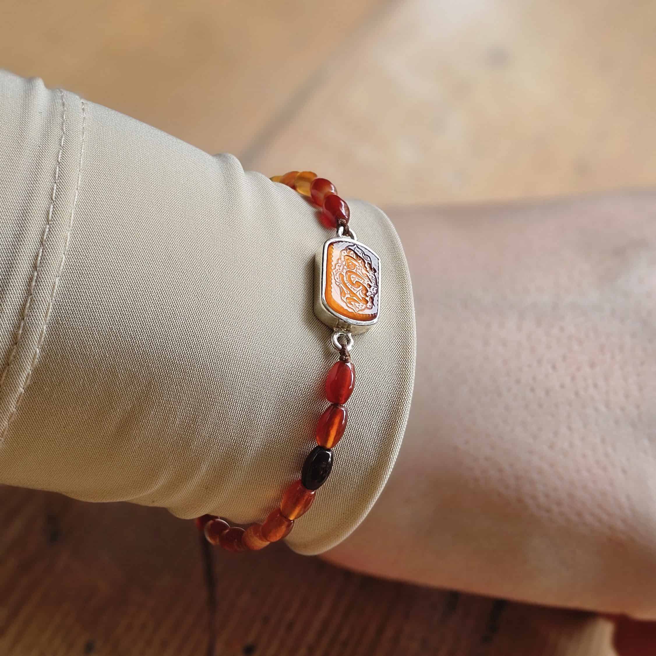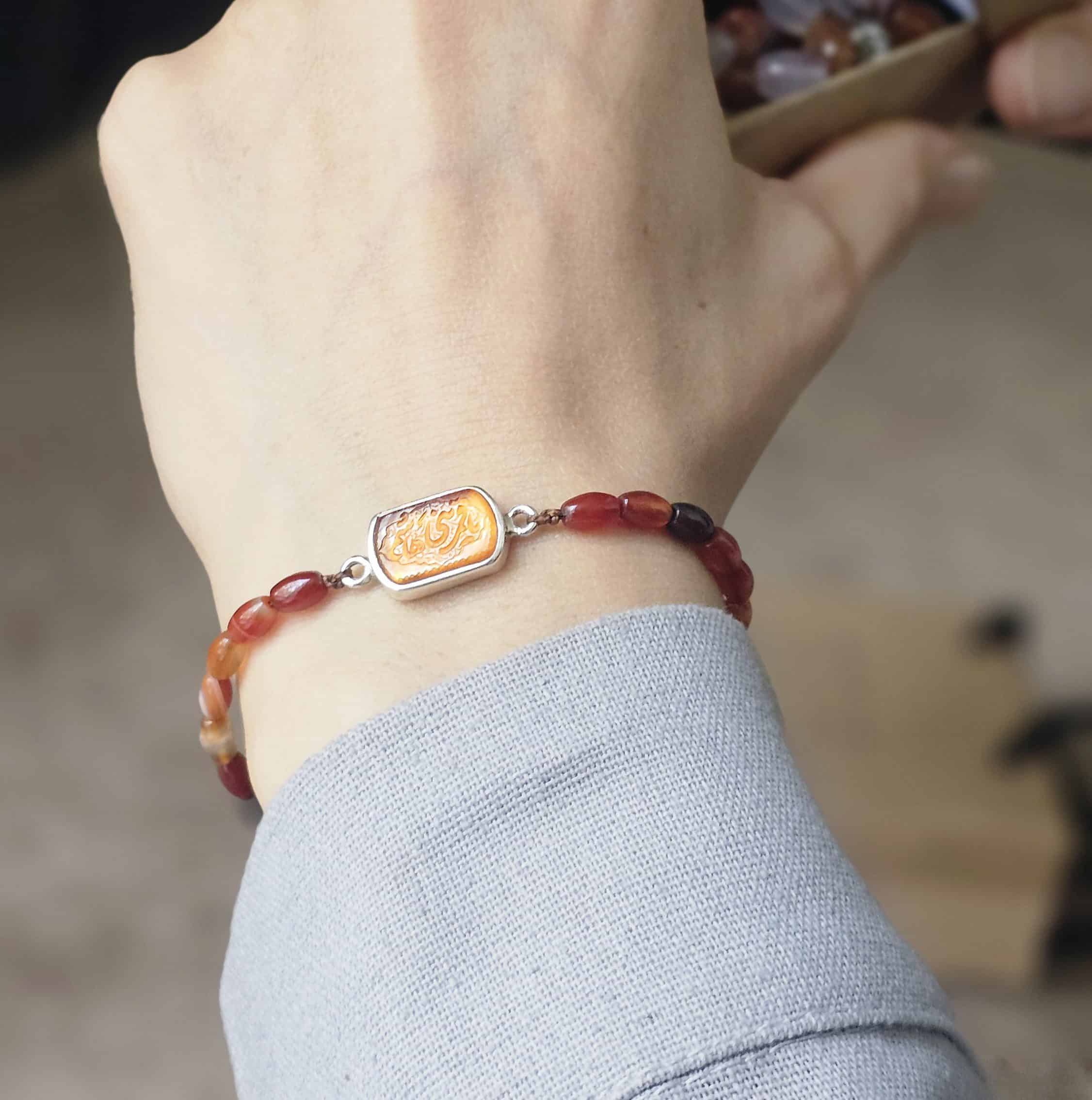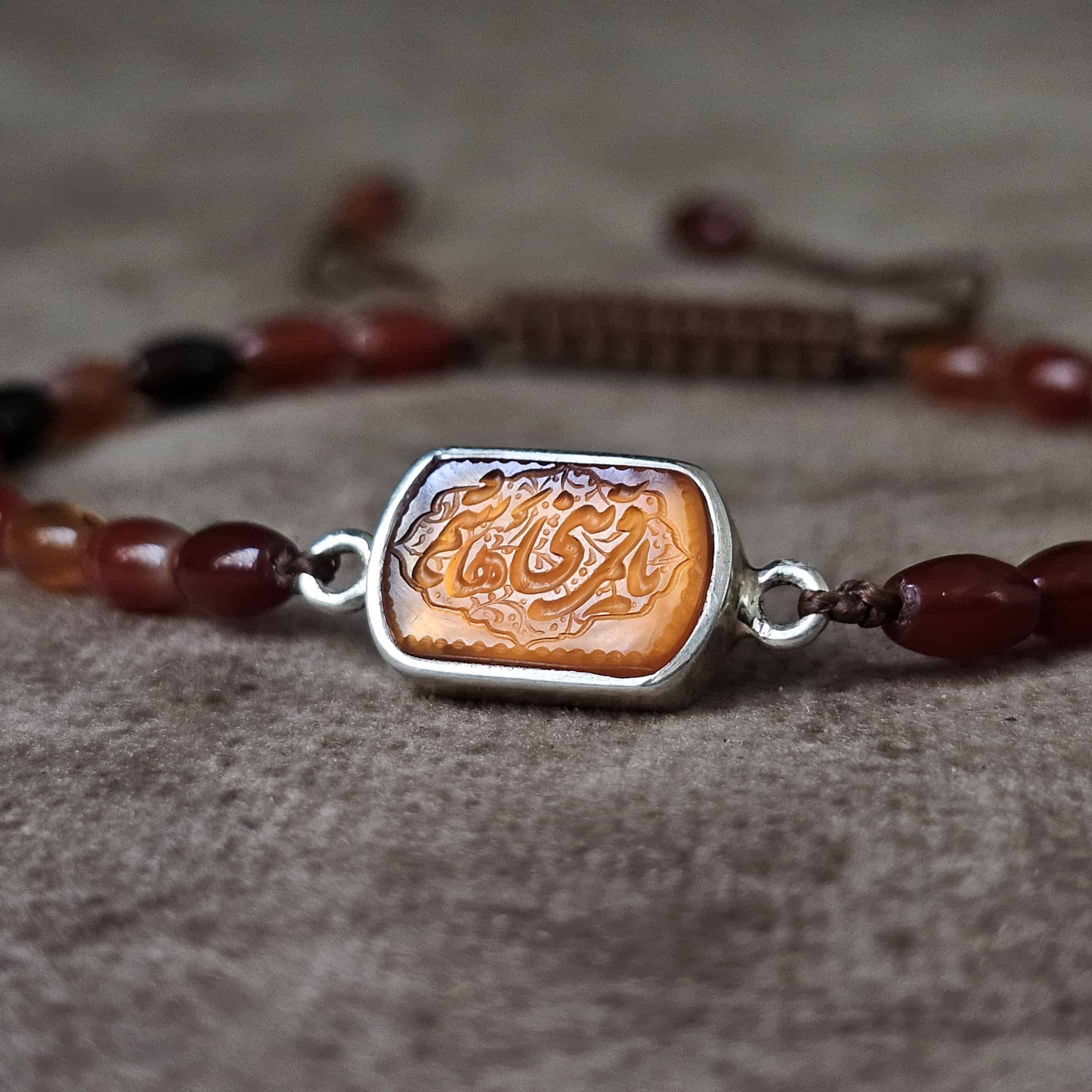 دستبند نقره دخترانه با نگین عقیق و حکاکی معنوی یا قمر بنی هاشم (ع).