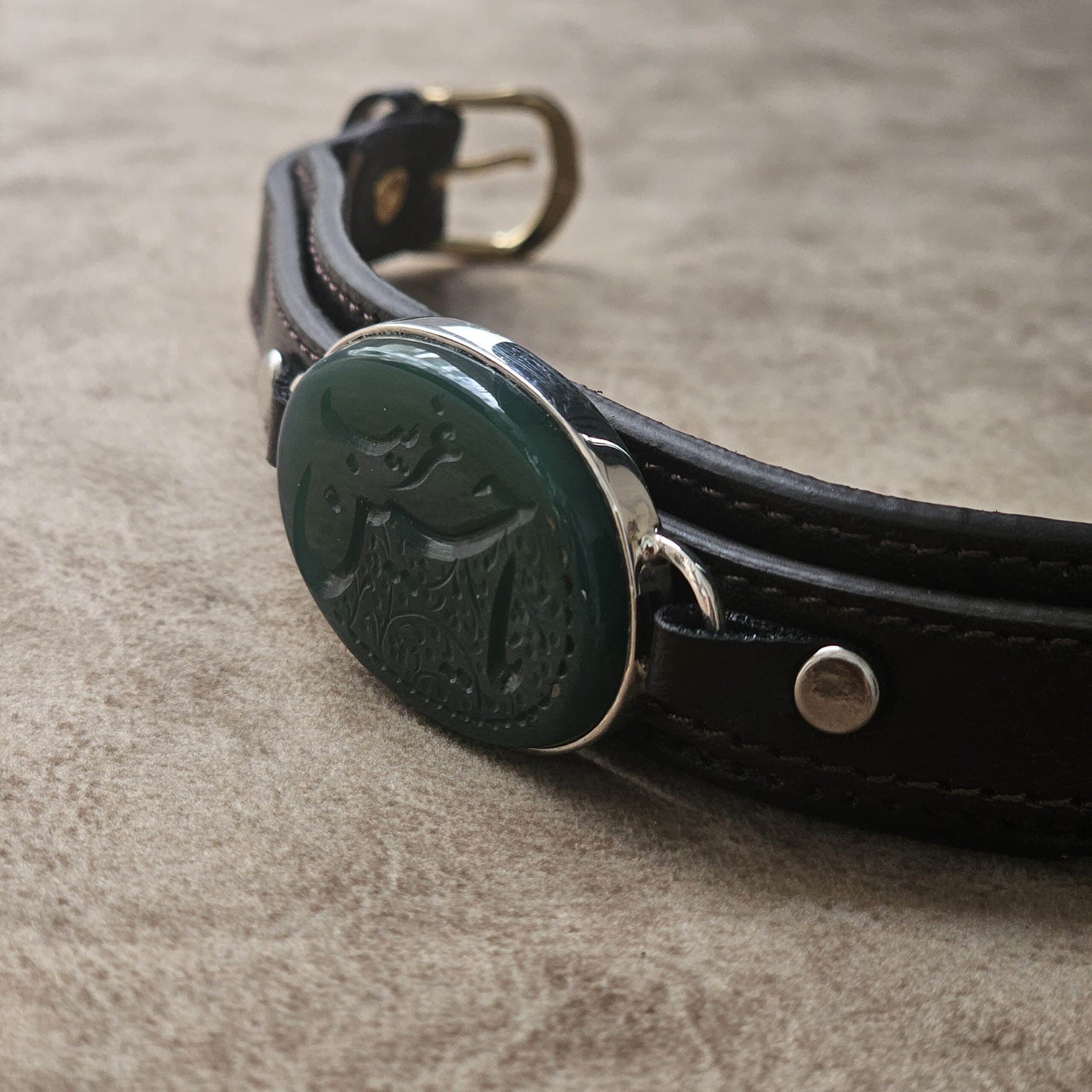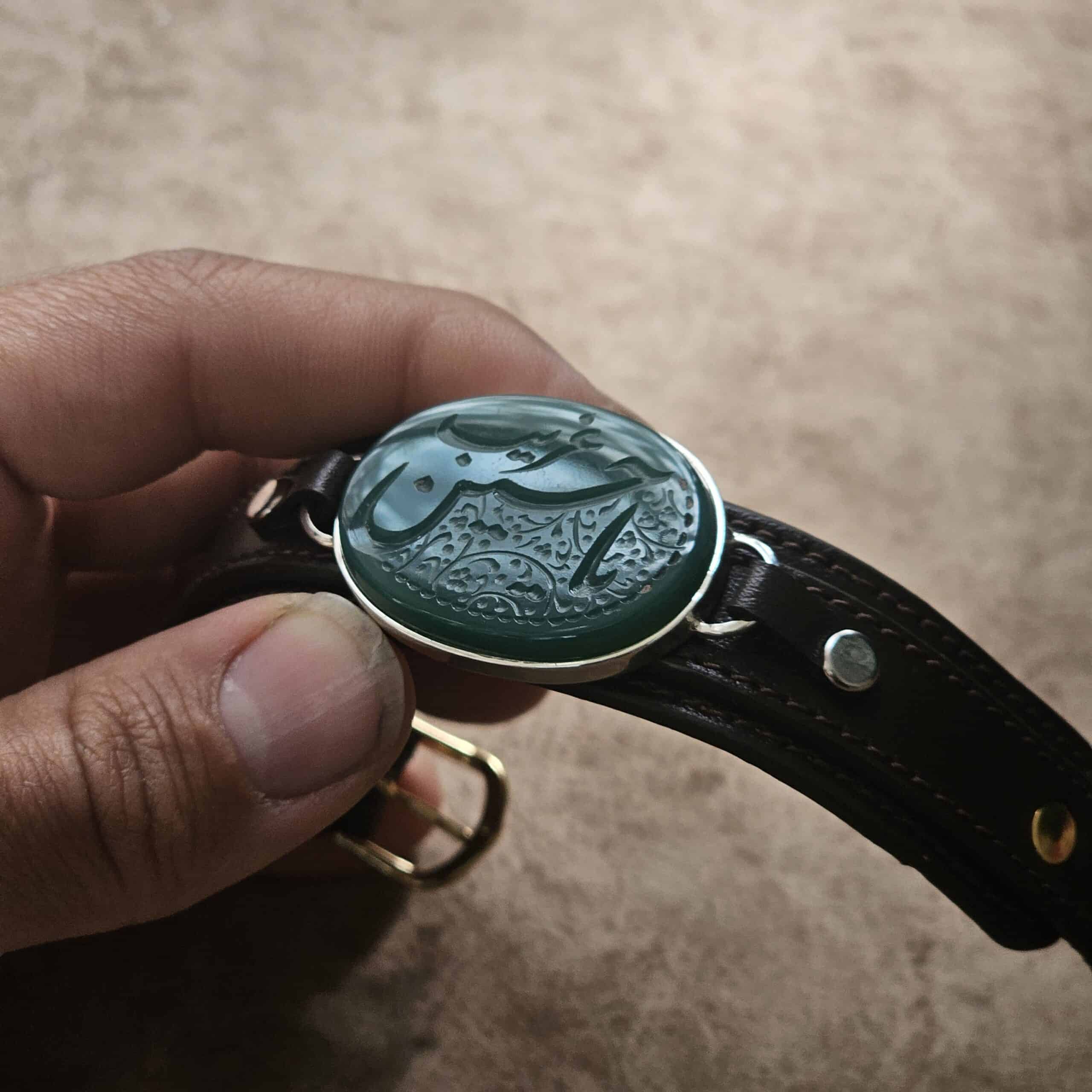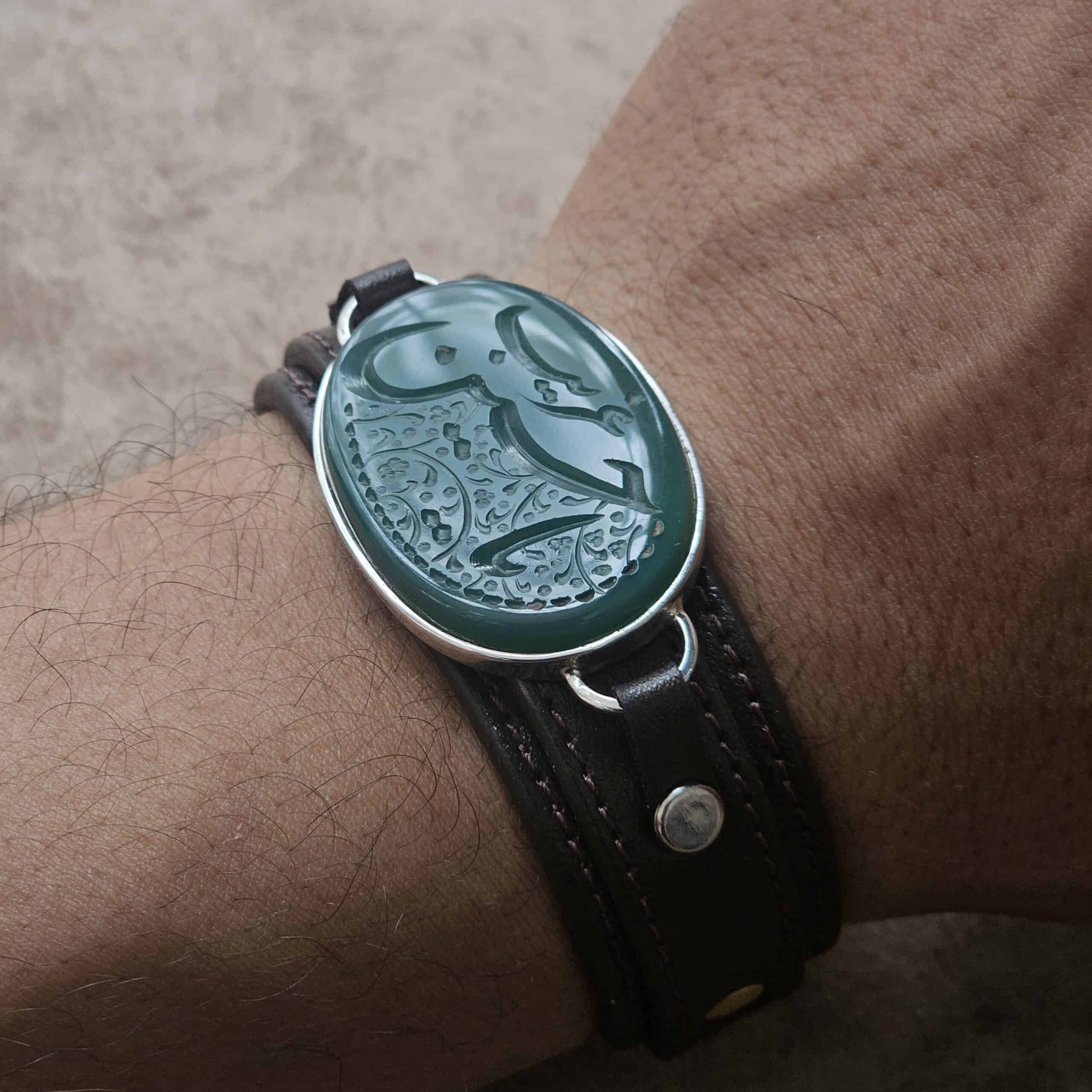 دستبند نقره عیار ۹۲۵ با نگین عقیق سبز و بند چرمی، مزین به طرح یا حسین غریب (ع)؛ ترکیبی از اصالت، معنا و استایل.