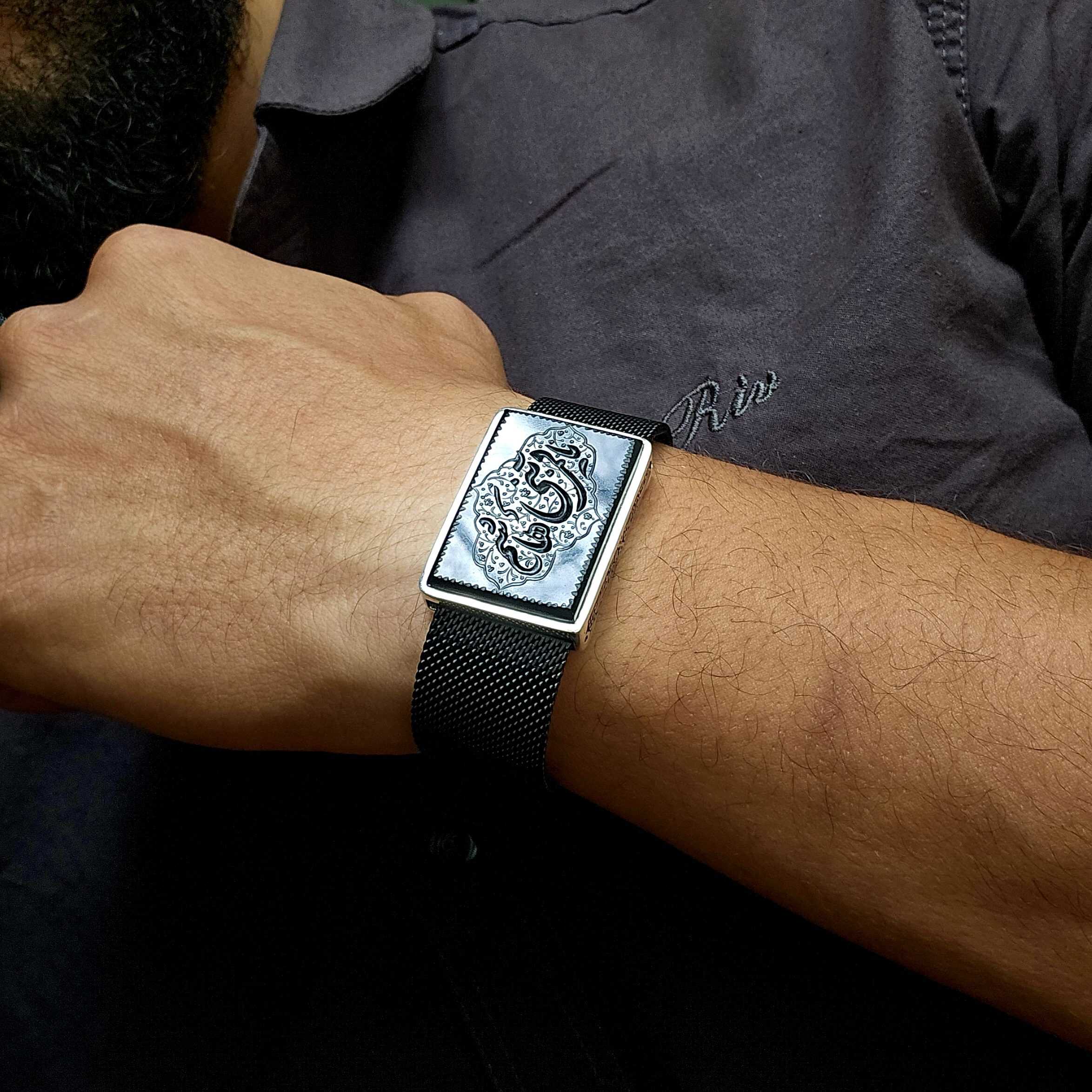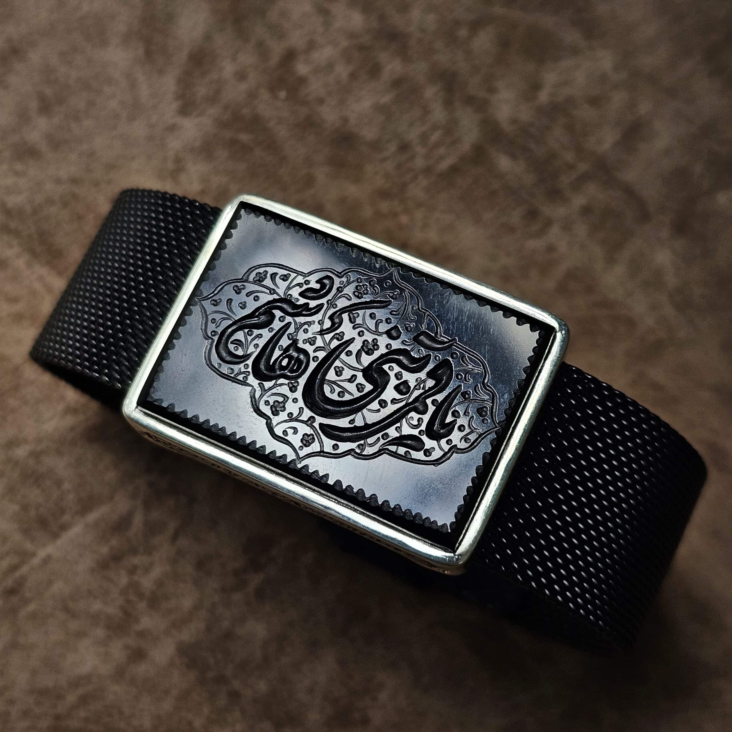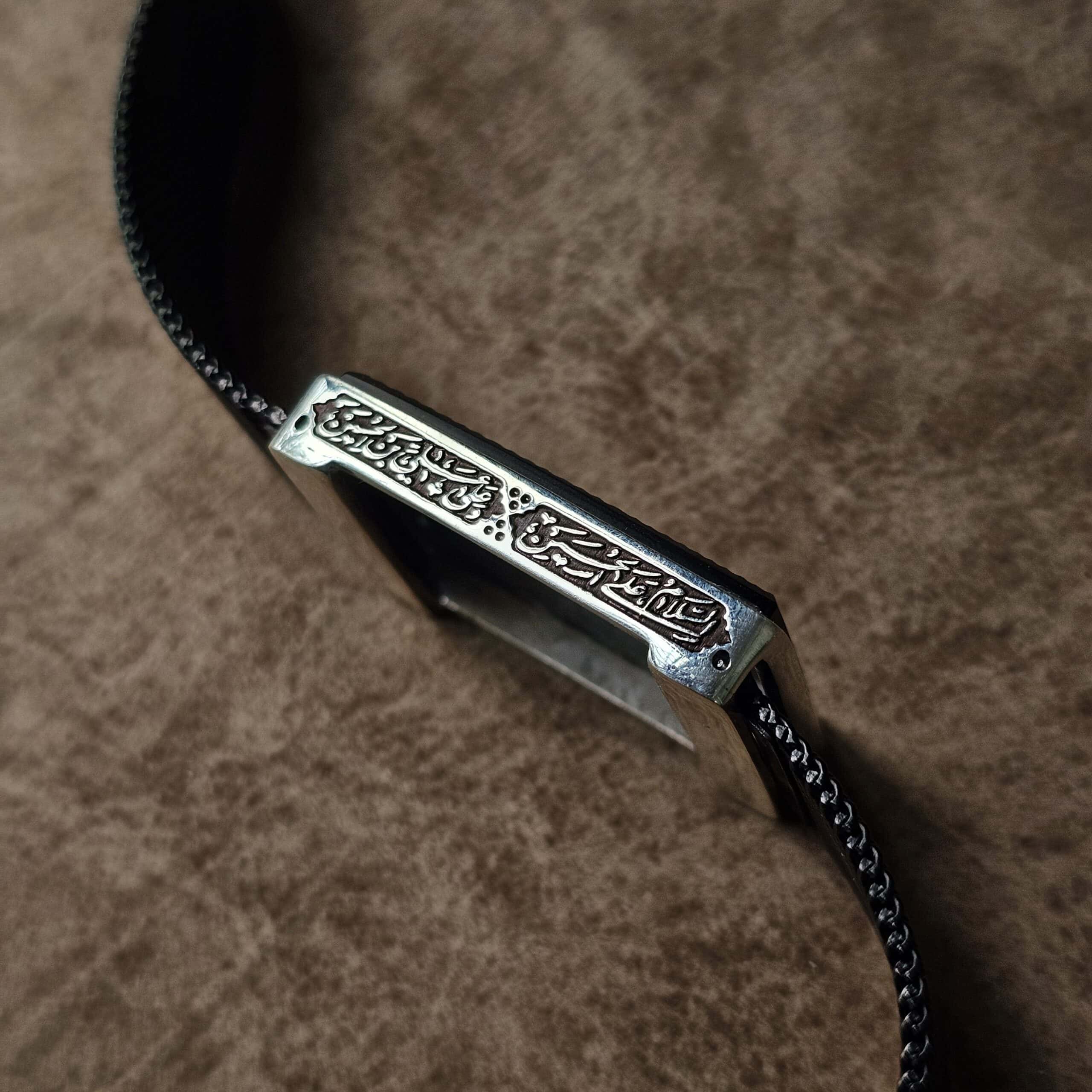این دستبند مردانه از نقره اصل با عیار ۹۲۵ ساخته شده و دارای نگینی از عقیق مشکی طبیعی است. روی نگین، حکاکی معنوی و ارزشمند یا قمر بنی هاشم قرار دارد که نمادی از ایثار، شجاعت و وفاداری حضرت عباس (ع) است. طراحی مردانه و استحکام بالای نقره در کنار سنگ عقیق مشکی، این دستبند را به انتخابی خاص و ماندگار برای دوستداران اهل بیت (ع) تبدیل کرده است.