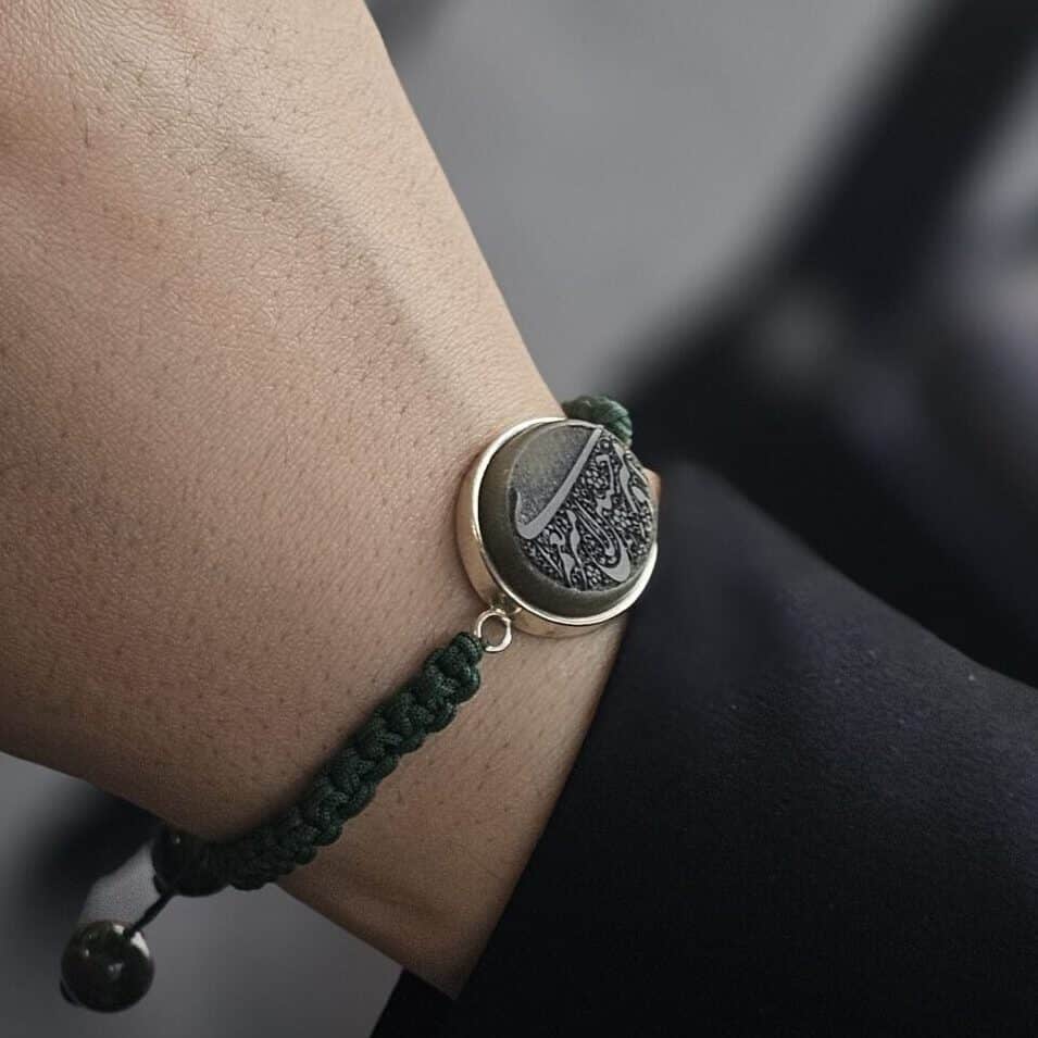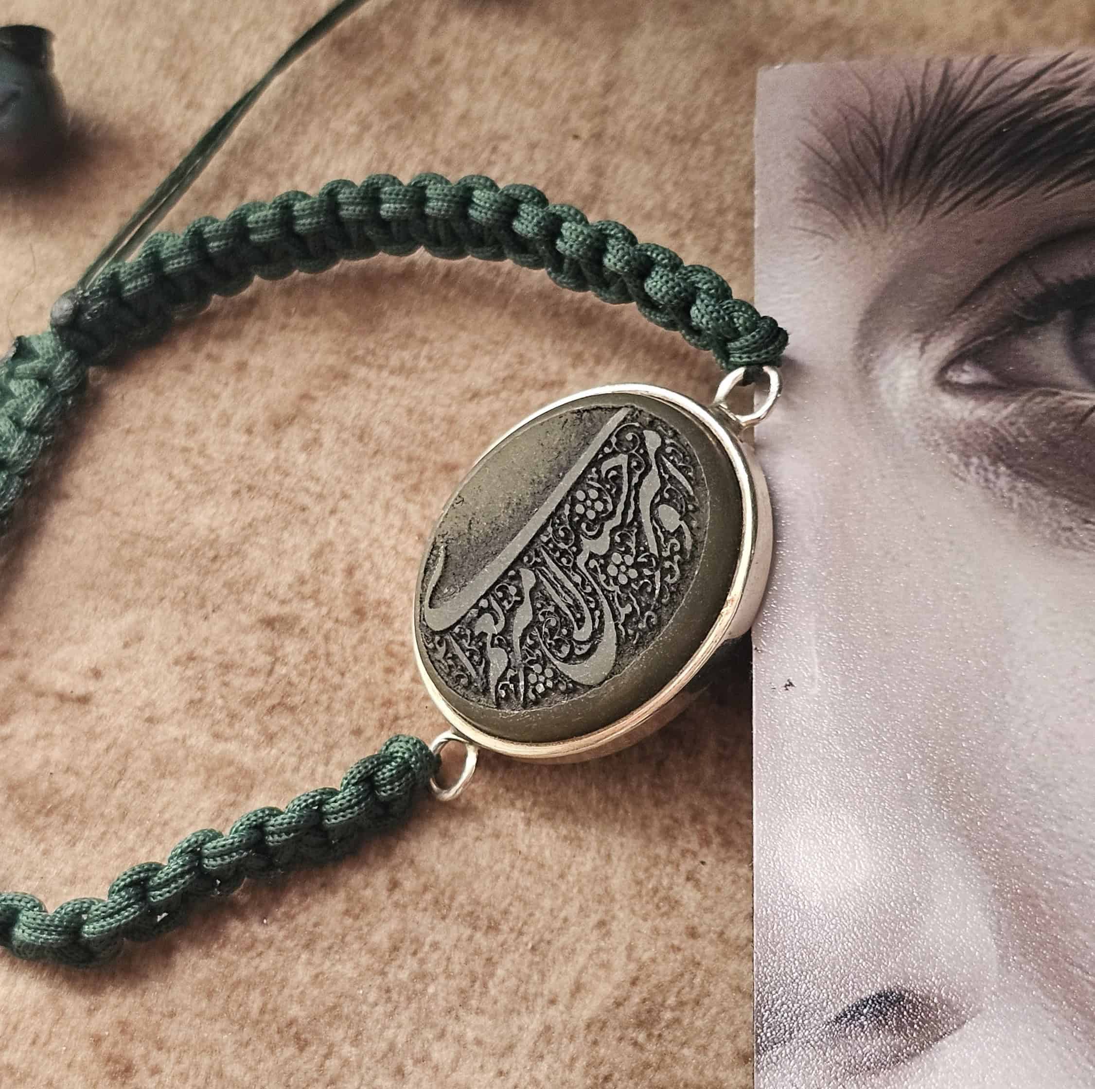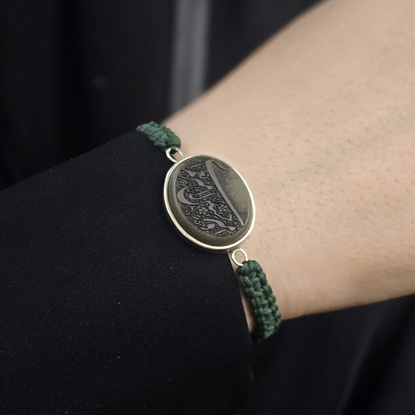 این دستبند نقره یشم خراسانی طرح امیری حسین و نعمالامیر، جلوهای باشکوه از عشق و ارادت به امام حسین (ع) و مولای متقیان حضرت علی (ع) است.