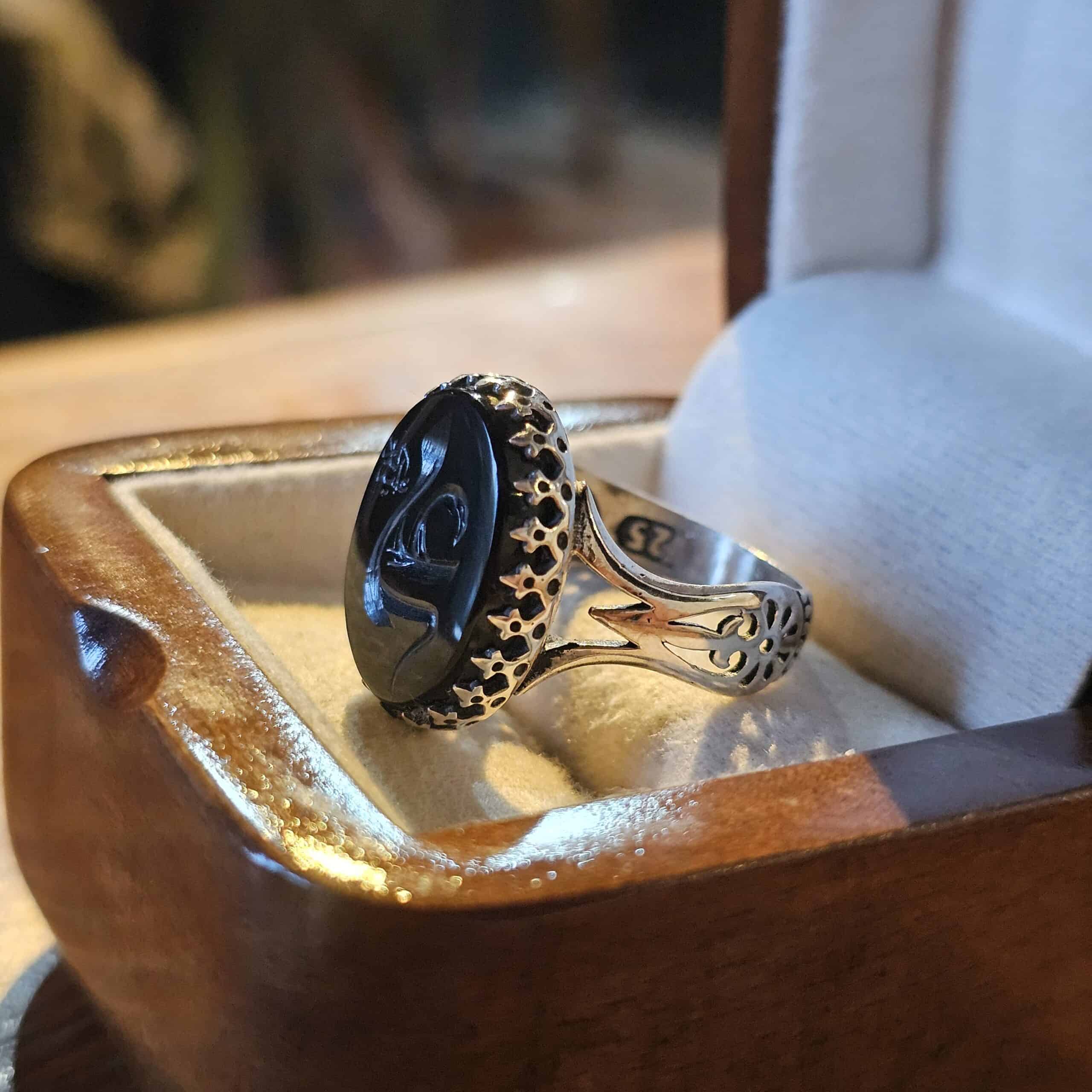 ست انگشتر و گردنبند نقره طرح ذوالفقار با نگین مزین به نام مبارک علی (ع)؛ ساختهشده از نقره اصل عیار ۹۲۵ همراه با نگین عقیق طبیعی حکاکیشده. انتخابی مناسب برای هدیه و استفاده روزانه.