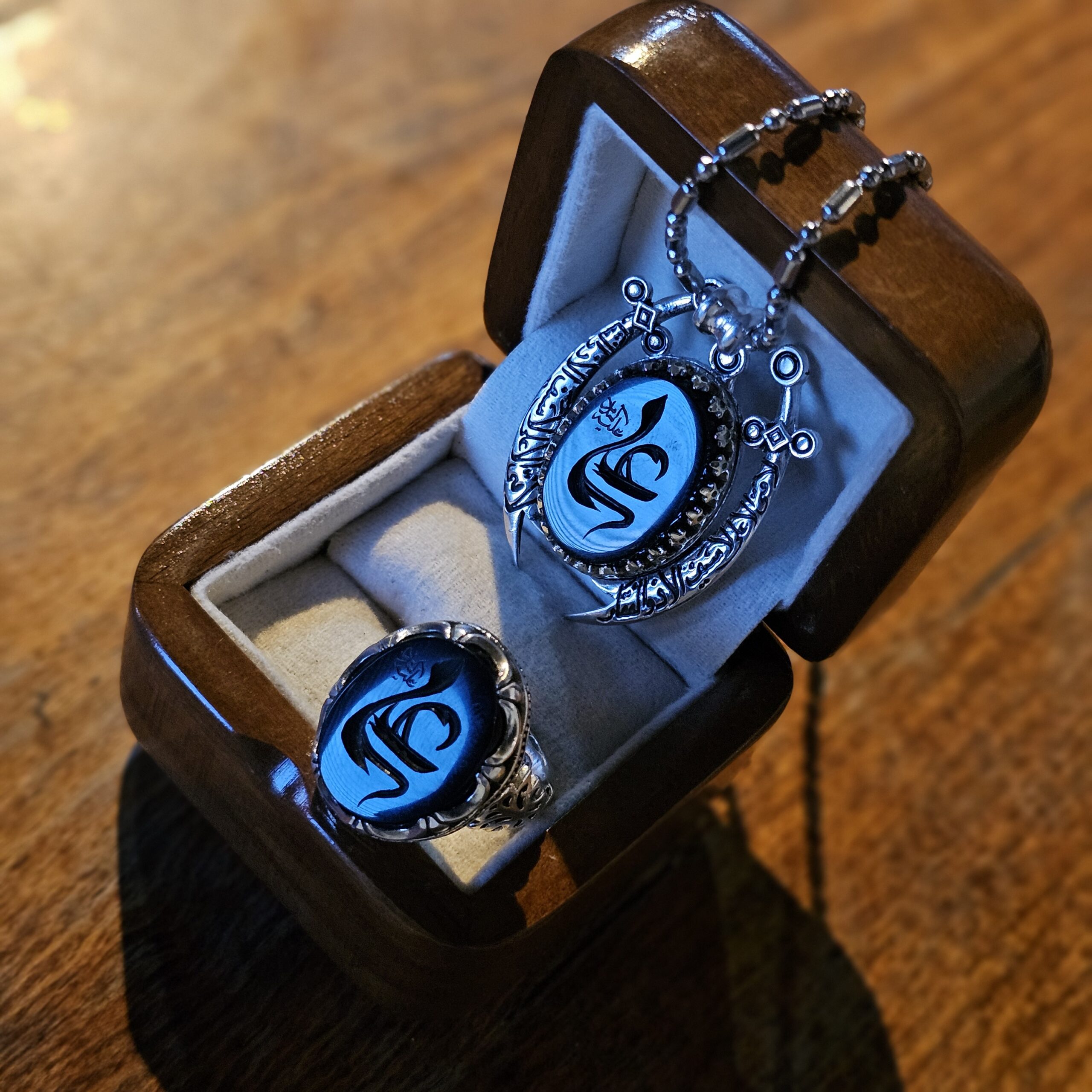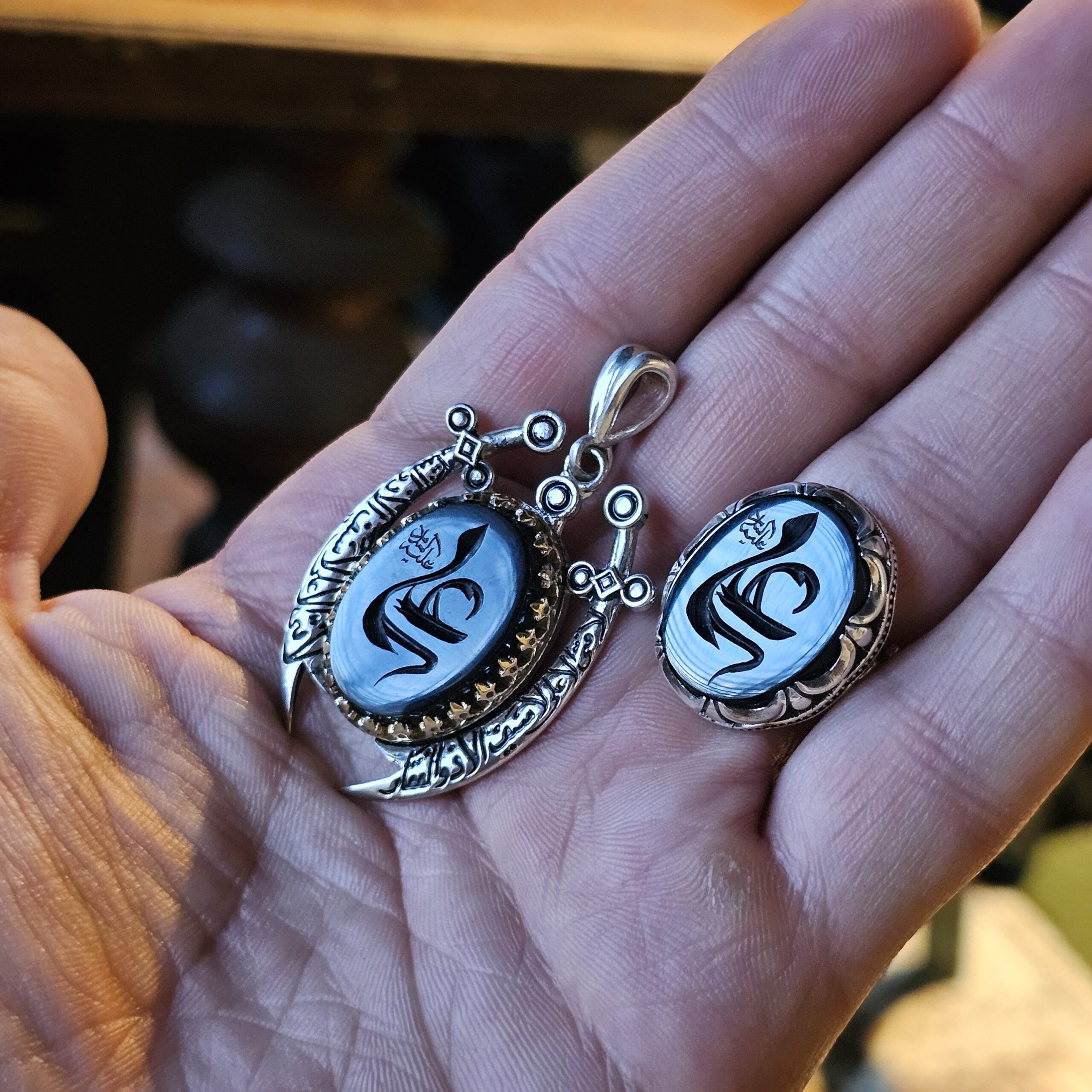 این ست جذاب شامل انگشتر نقره مردانه و گردنبند نقره طرح ذوالفقار است که هر دو با نگین زیبای عقیق طبیعی و حکاکی دستی نام مبارک علی (ع) تزیین شدهاند.