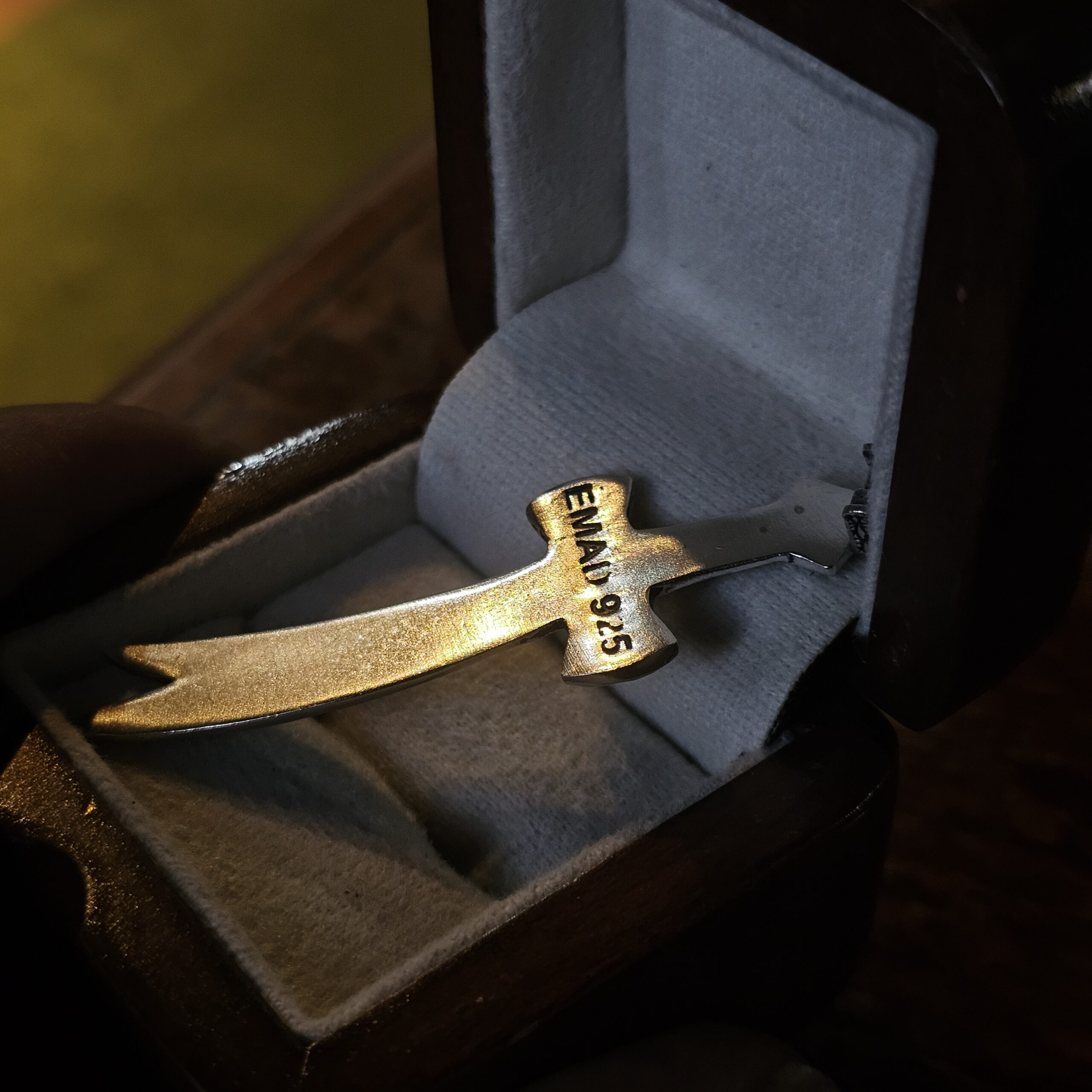 گردنبند نقره طرح شمشیر ذوالفقار – نقش علی مع الحق و الحق مع علی + اشهد ان علیاً ولیالله یک زیور فاخر و کاملاً معنوی است که جلوهای خاص به استایل شما میدهد. این گردنبند از نقره اصل با عیار ۹۲۵ ساخته شده و طرح شمشیر مبارک ذوالفقار با جزئیات دقیق و حکاکیهای بسیار زیبا روی آن کار شده است.