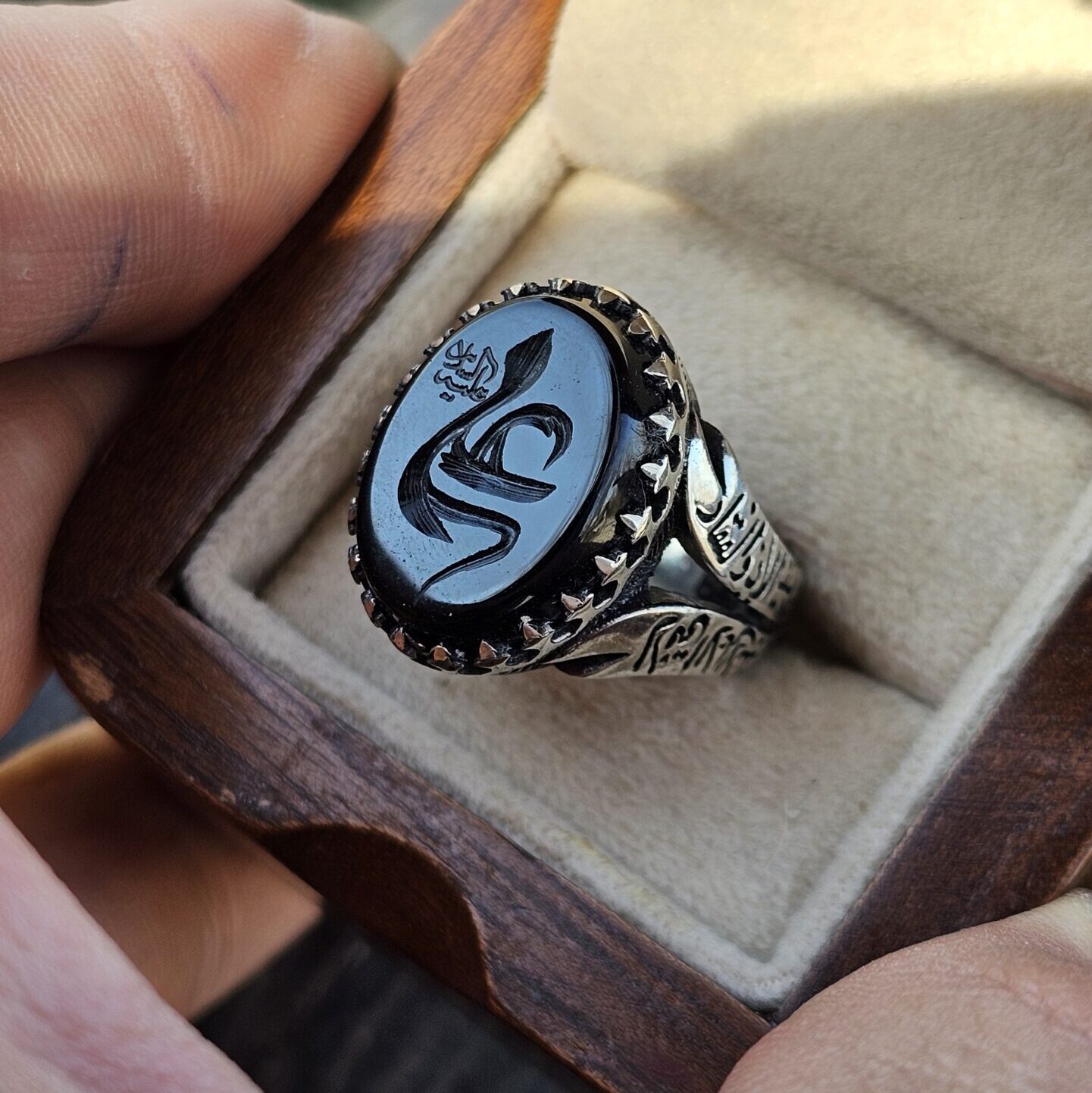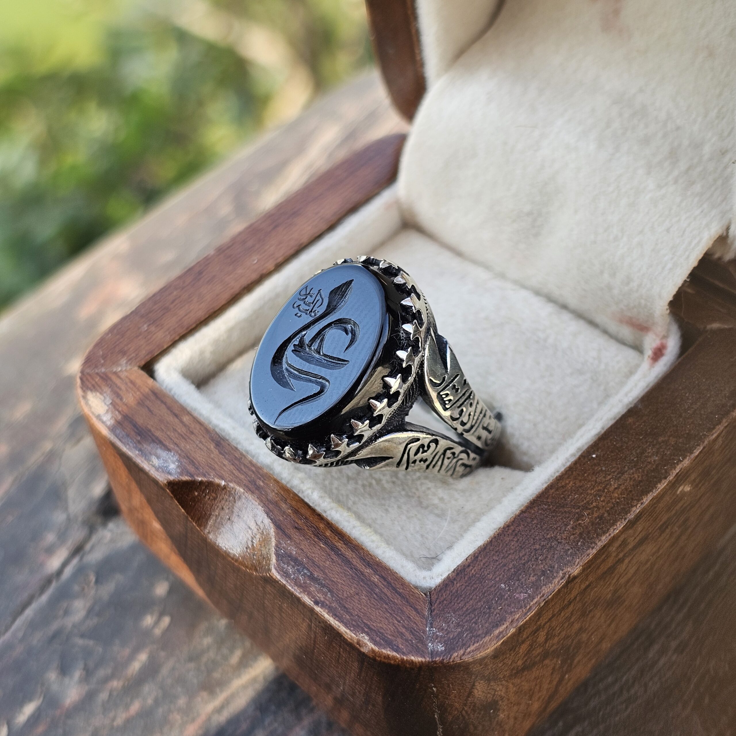 این انگشتر از جنس نقره روس ساخته شده و پرداخت سطح آن براق و مقاوم است. طراحی خوشدست آن باعث میشود برای استفاده طولانیمدت، مجالس مذهبی و هدیهای ویژه بسیار مناسب باشد.