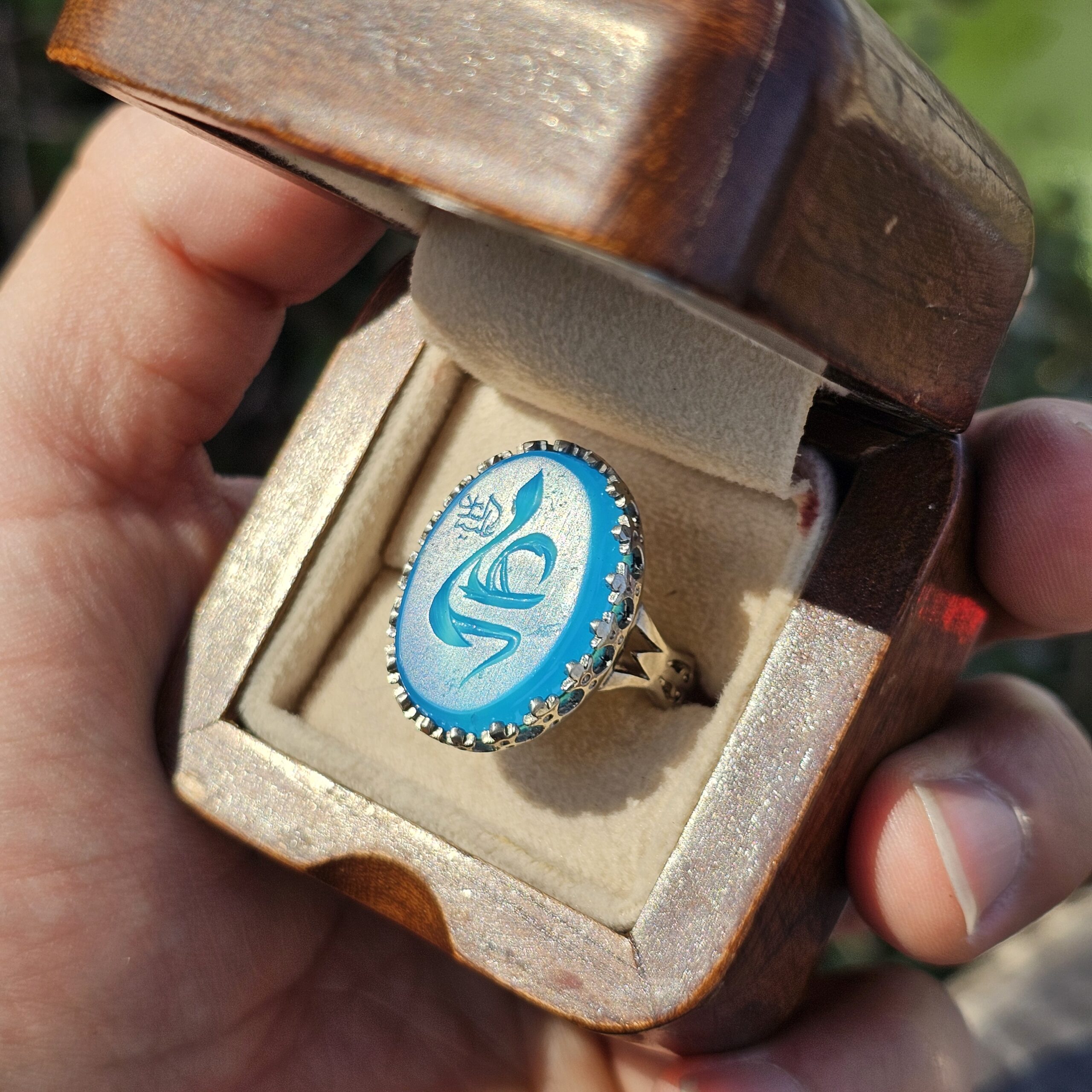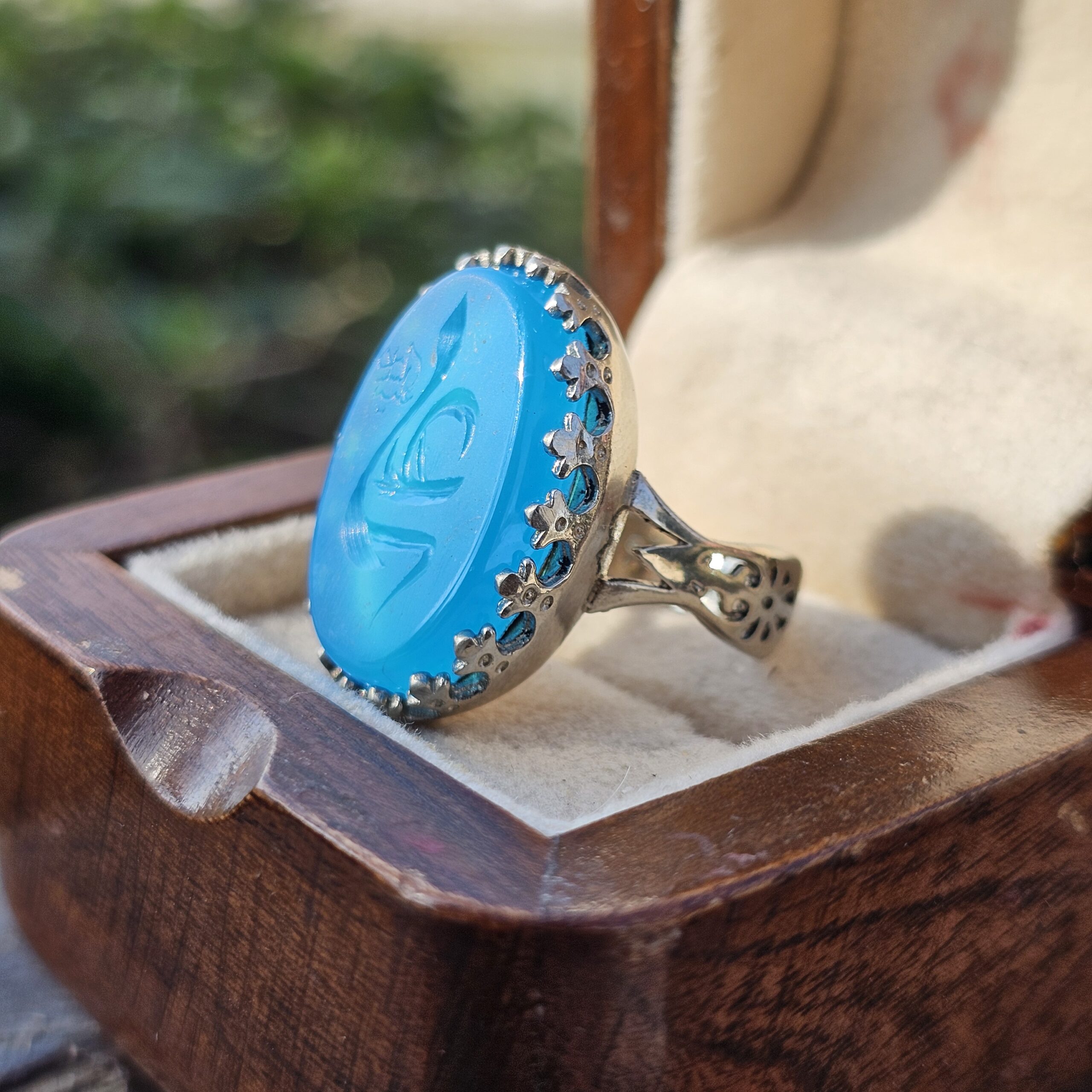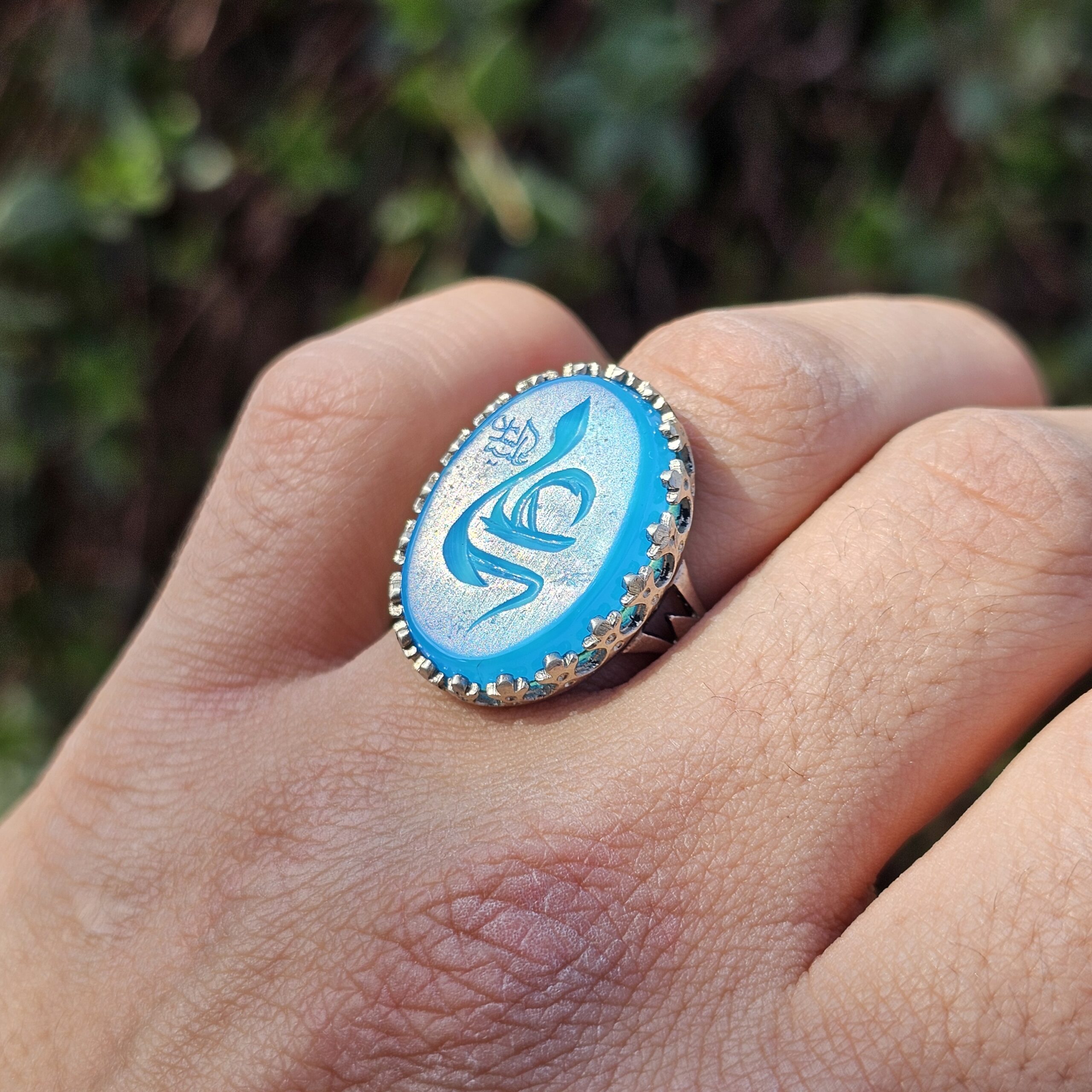 انگشتر مردانه نقره روس با نگین عقیق آبی طرح «علی (ع)» با الهام از نام مبارک حضرت امیرالمؤمنین (ع) طراحی شده و ترکیبی از زیبایی، وقار و جلوهای معنوی را ارائه میدهد. رنگ آرام و دلنشین عقیق آبی در کنار درخشندگی نقره روس، ظاهری متفاوت و چشمنواز به این انگشتر بخشیده است.