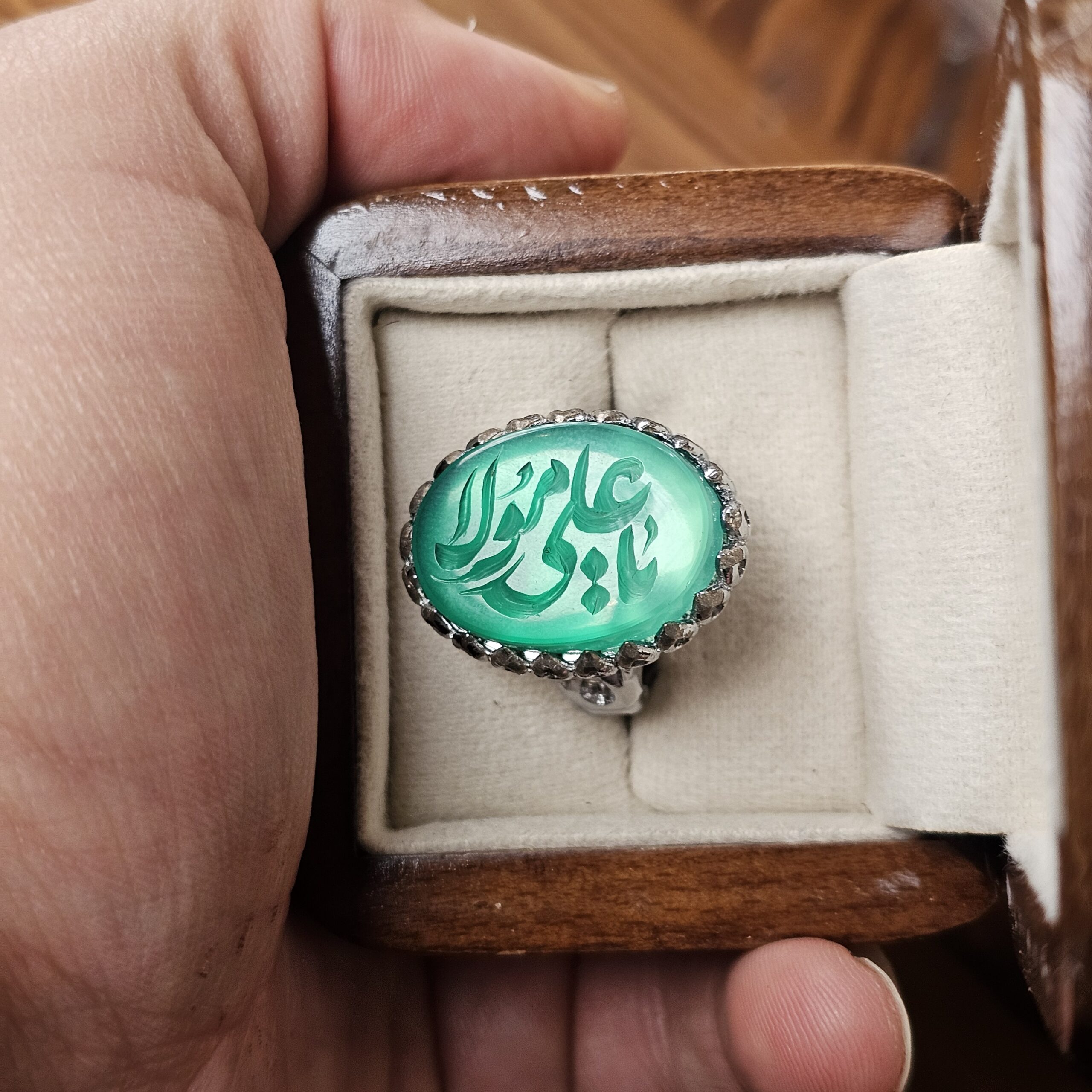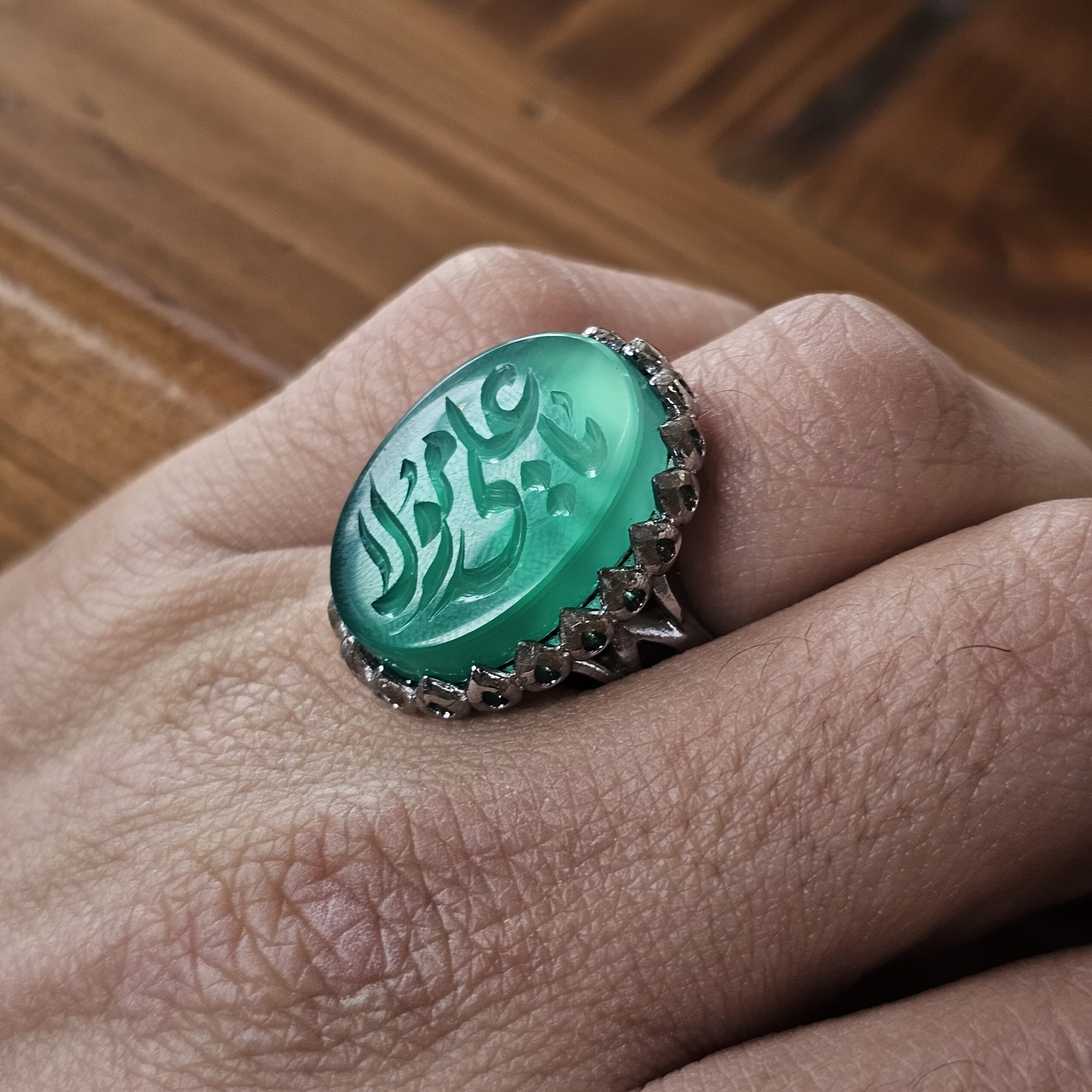 انگشتر نقره روس مردانه طرح «یا علی مولا» با عقیق سبز طبیعی