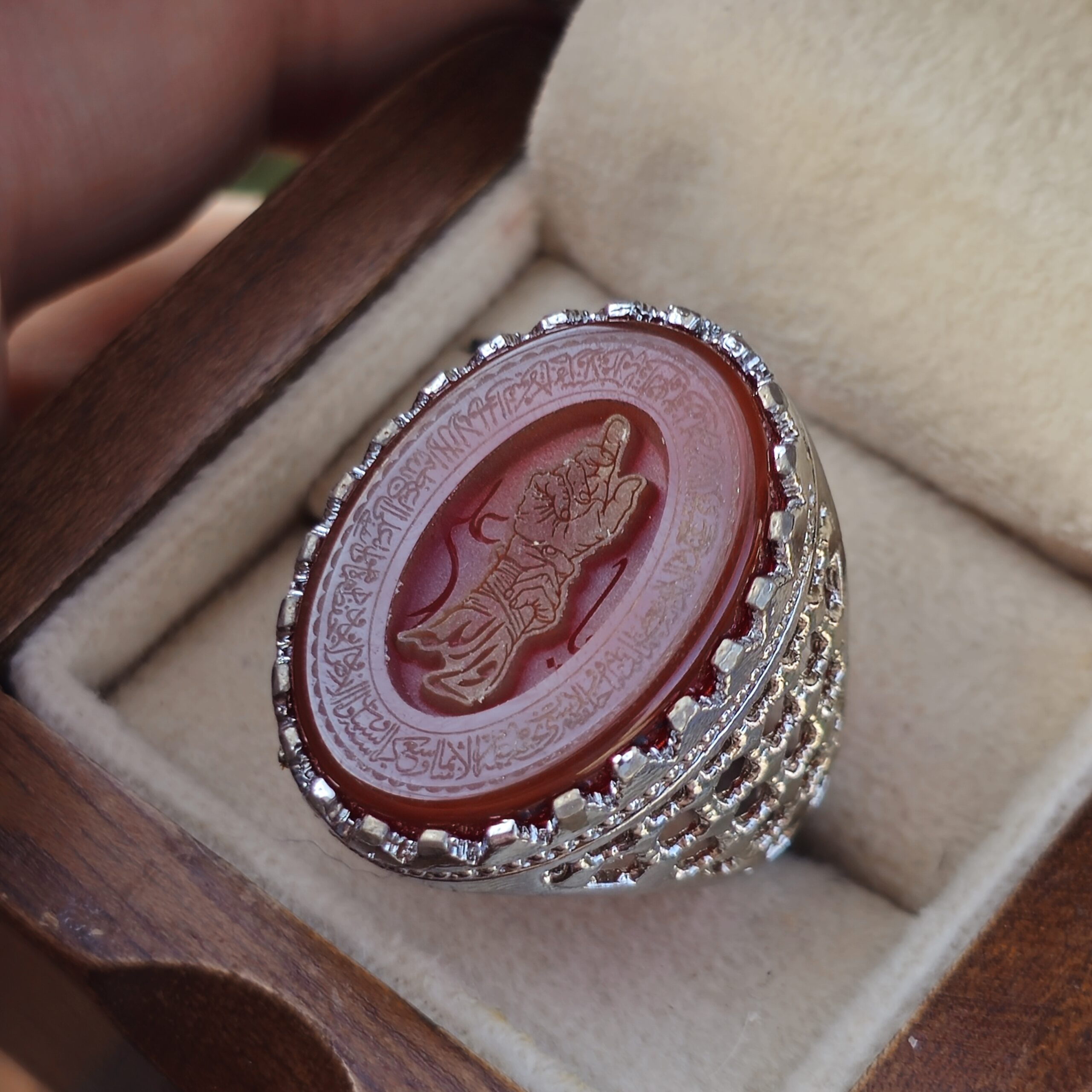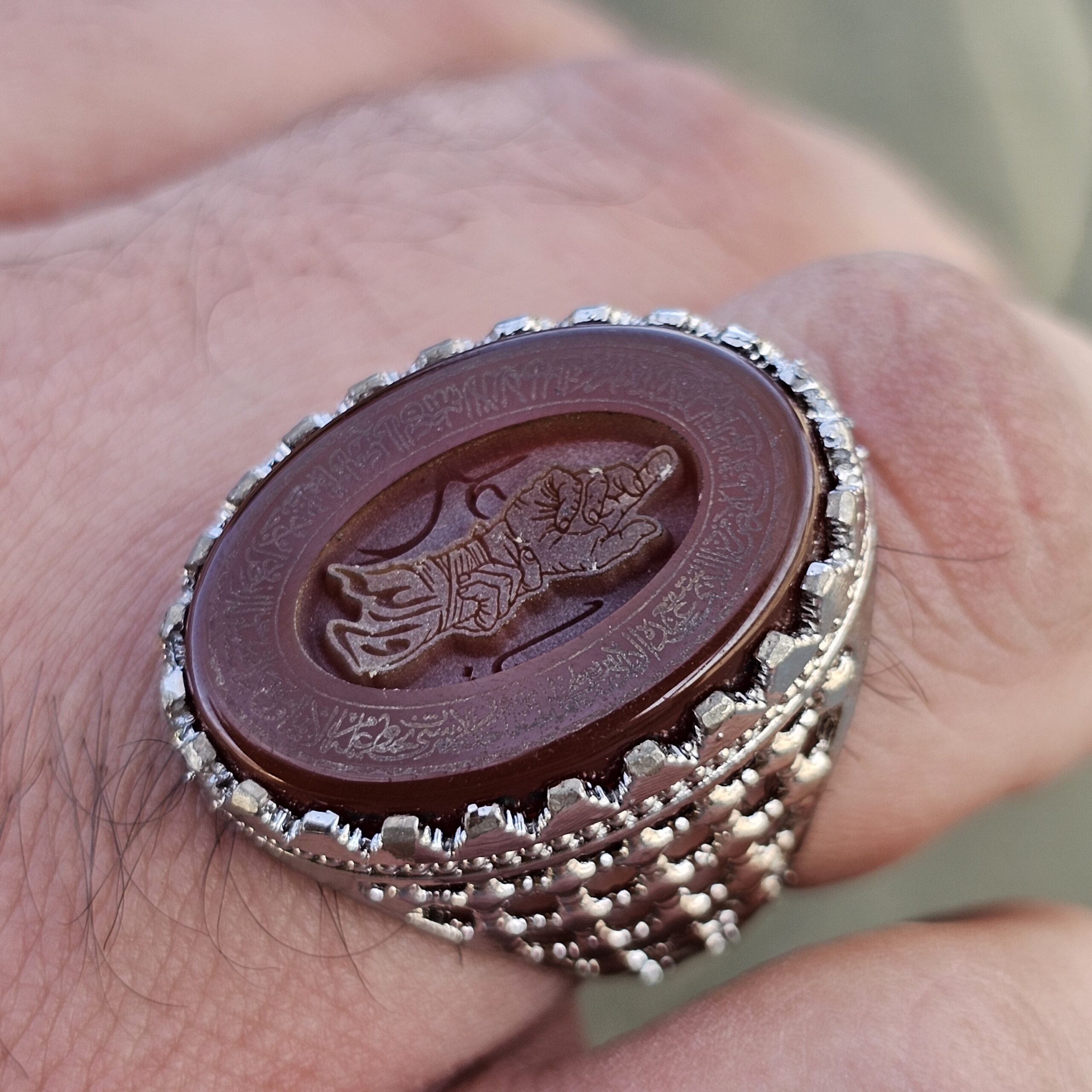 نگین عقیق سرخ طبیعی با رنگ گرم و درخشان خود جلوهای خاص به این انگشتر بخشیده و حکاکی مذهبی روی نگین، یادآور پیوند عمیق با فرهنگ ولایت و محبت اهلبیت (ع) است. رکاب از نقره روس ساخته شده و با پرداخت مناسب، استحکام و ماندگاری خوبی در استفاده روزمره دارد.
