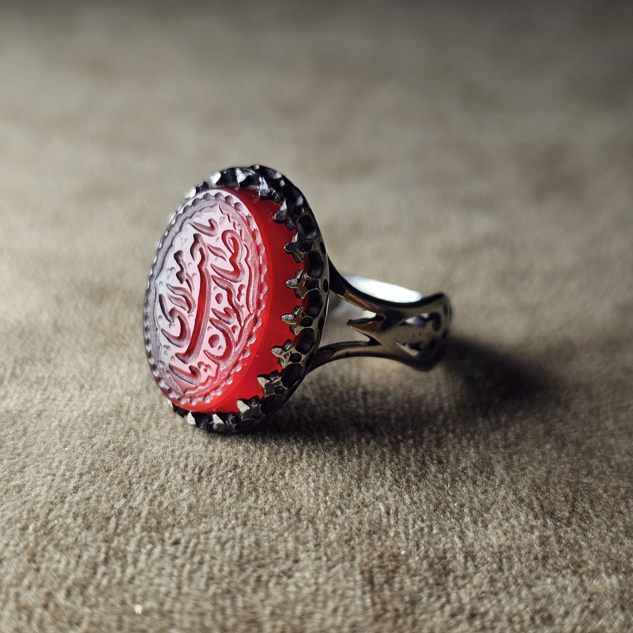 انگشتر مردانه نقره روس با نگین عقیق سرخ و نقش «یا مولای یا صاحب‌الزمان (عج)» انتخابی خاص برای آقایانی است که به زیورآلات مذهبی با جلوه‌ای قدرتمند و معنوی علاقه دارند. رنگ سرخ عقیق، درخشش عمیق و جذابی ایجاد می‌کند و در کنار رکاب مردانه، جلوه‌ای باوقار و چشمگیر روی دست به نمایش می‌گذارد.