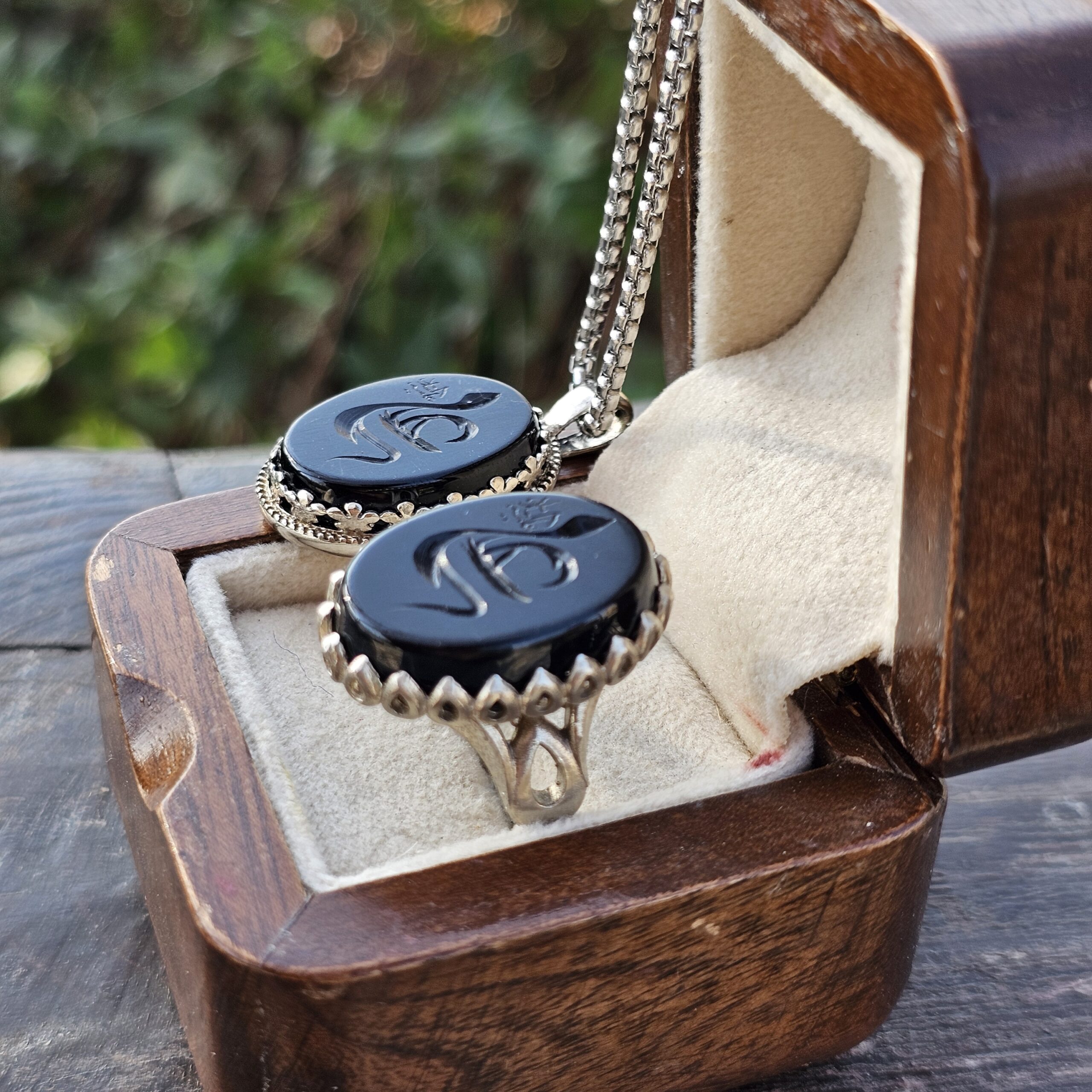 نگین‌های عقیق مشکی طبیعی با رنگ عمیق و براق، در کنار رکاب و پلاک ساخته‌شده از نقره روس، ظاهری سنگین و در عین حال شیک ایجاد کرده‌اند. پرداخت دقیق و طراحی هماهنگ انگشتر و گردنبند، این ست را به انتخابی مناسب برای استفاده روزمره، مجالس مذهبی و هدیه‌ای ماندگار تبدیل می‌کند.